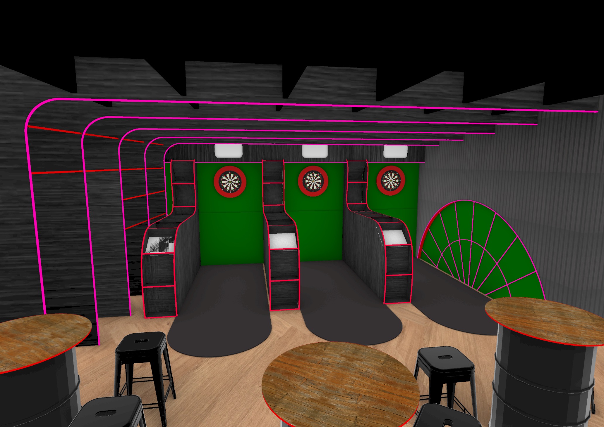 pink lines on the left ceiling and the pink curves and lines on the right are magenta red led lights the six white squares are tv screen score boards accentuate the three dart boards with lighting from top and side the beams of black wood as well as the small slabs on the right wall add hanging plants and greenery on the shelfs on the left overall warm vibe cozy darker with red magenta lights the three dark grey rounded shapes on the ground are carpets