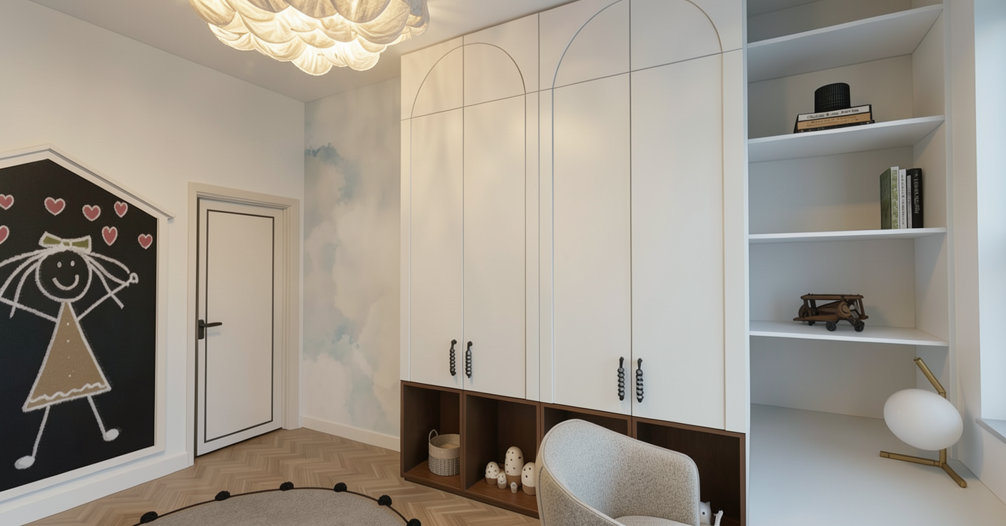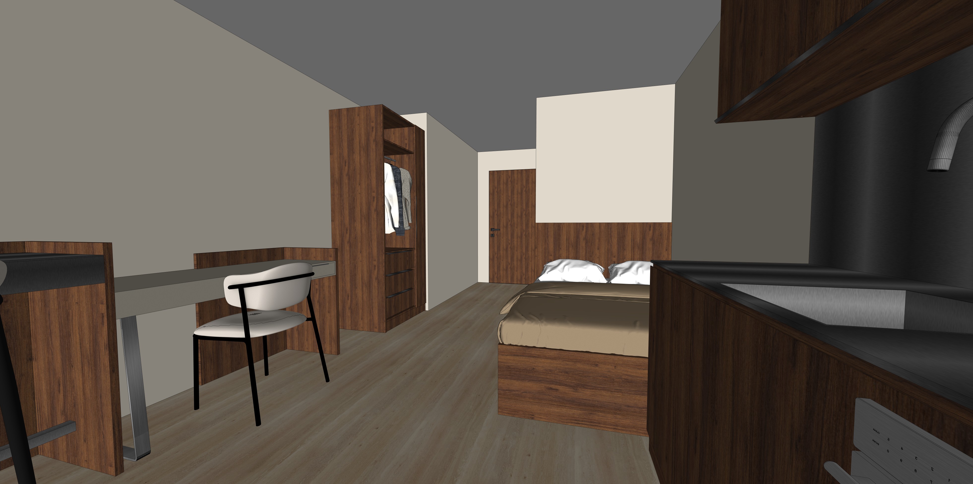 this should be a highquality and homely image of a student accommodations it should be photorealistic and features materials such as a brown wooden walnut veneer stainless steel kitchen tops and work spaces a beige grey laminate top for the desk and under bed storage the floor is a light sycamore coloured hardwood floor the chairs are upholstered in a white woven fabric there is some natural light coming in from behind the camera the ceiling is painted white the walls are a lightly textured beige colour the wall to the right of the bed and behind the bed has a ceiling integrated strip of led running to the end of the kitchen unit the wardrobe has an led strip along the clothing rail