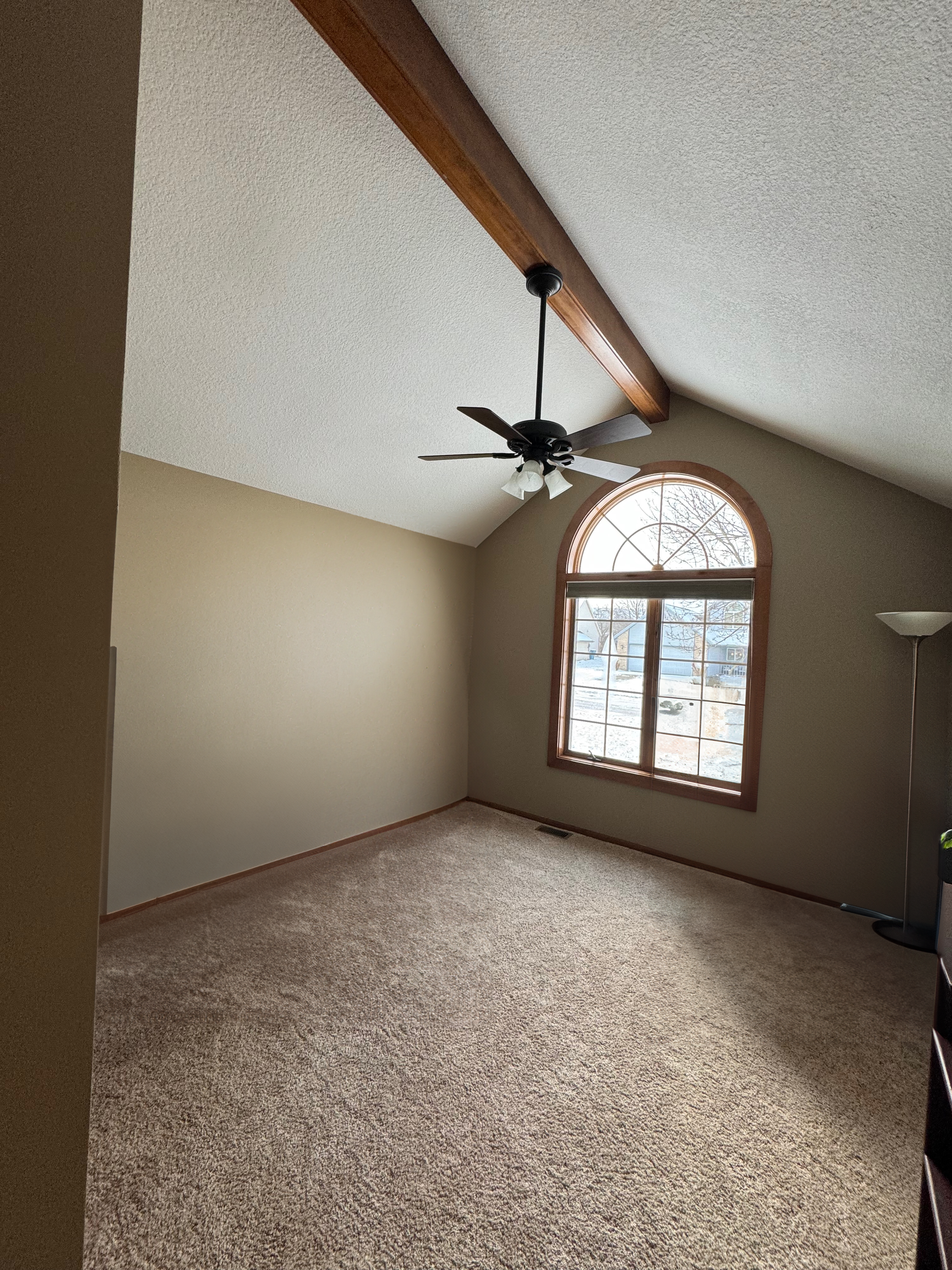 modern interior shot light grey wall paint brown carpet medium brown trim wallpaper on ceiling architecture