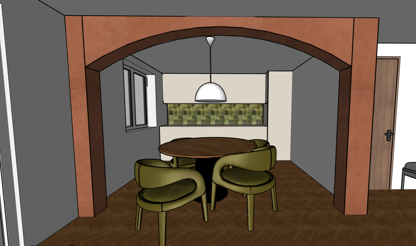 green tiles on kitchen wall in the middle of the kitchen cabinets