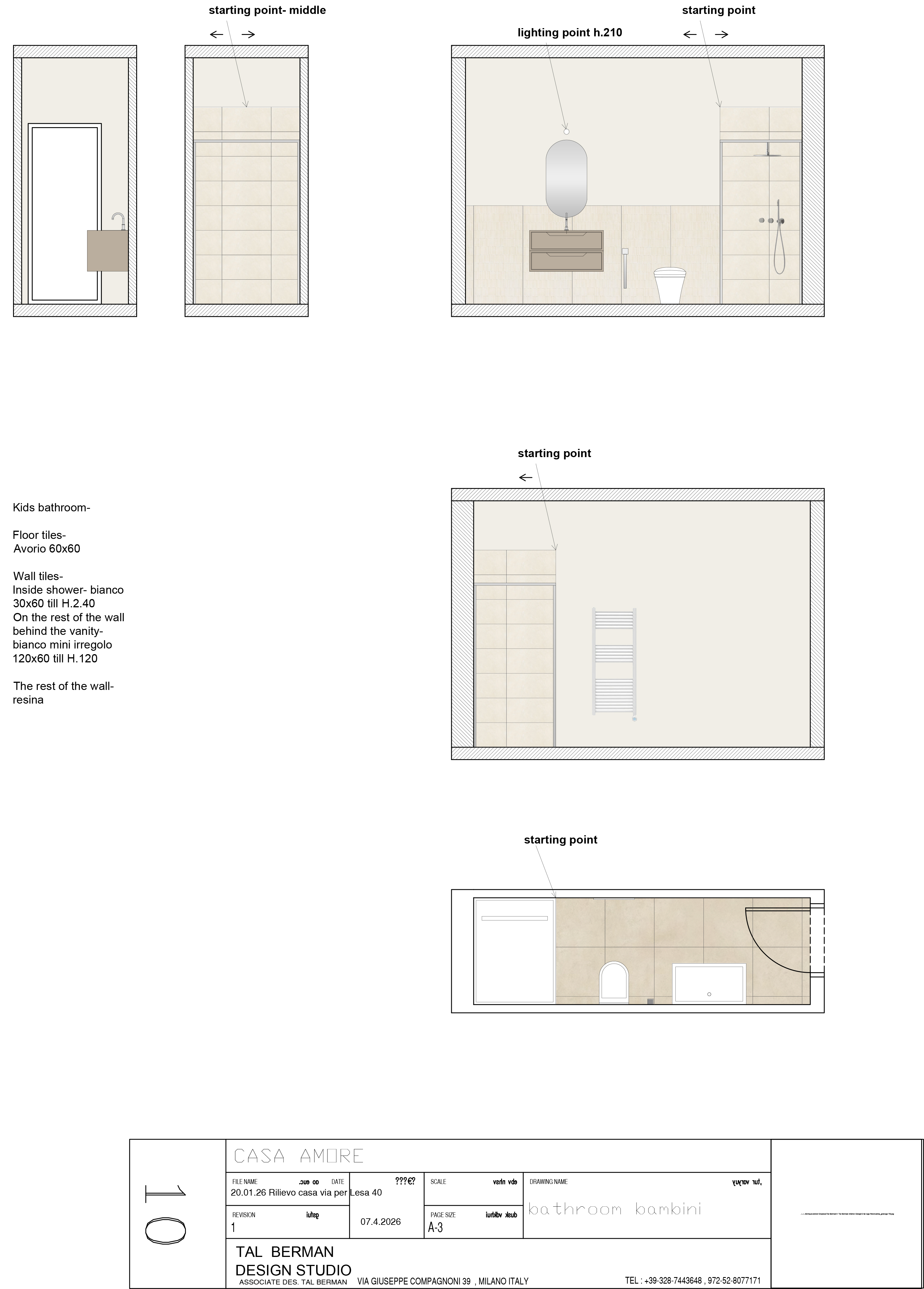 render a modern kids bathroom with a cozy atmosphere use ivory avorio 60x60 tiles for the floor creating a soft warm base inside the shower use white bianco 30x60 tiles up to a height of 2 40 meters for a clean fresh look behind the vanity mix textures with bianco mini in regolo 120x60 tiles up to 1 20 meters for a striking accent wall keep the remaining walls in a smooth neutral resin to maintain warmth incorporate a sleek vanity with a modern oval mirror above accented by gentle ambient lighting at height 2 10 meters opt for soft beige and grey tones to complement the ivory and bianco creating a serene and inviting space