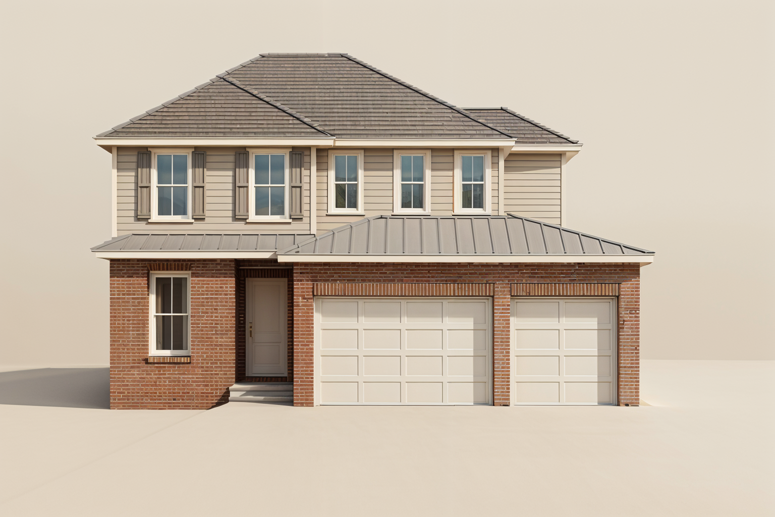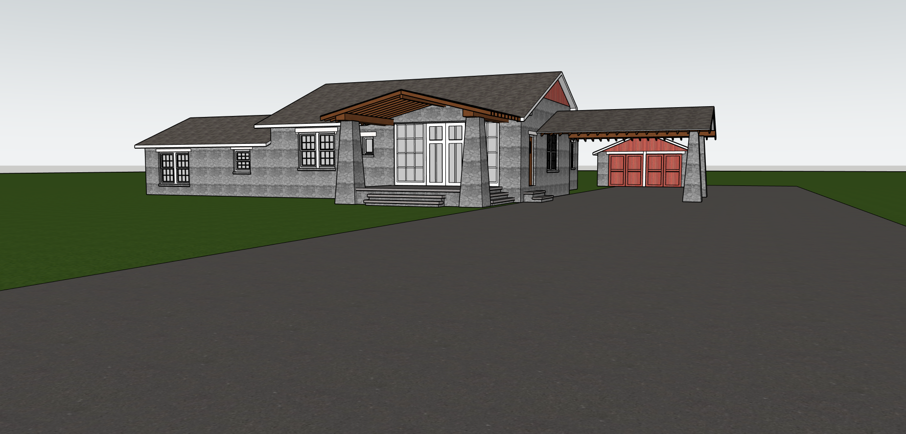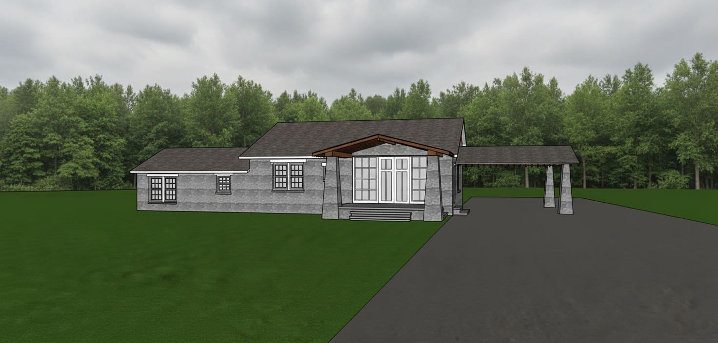 realistic rendering manicured lawn cloudy sky wooded background simple shrubs