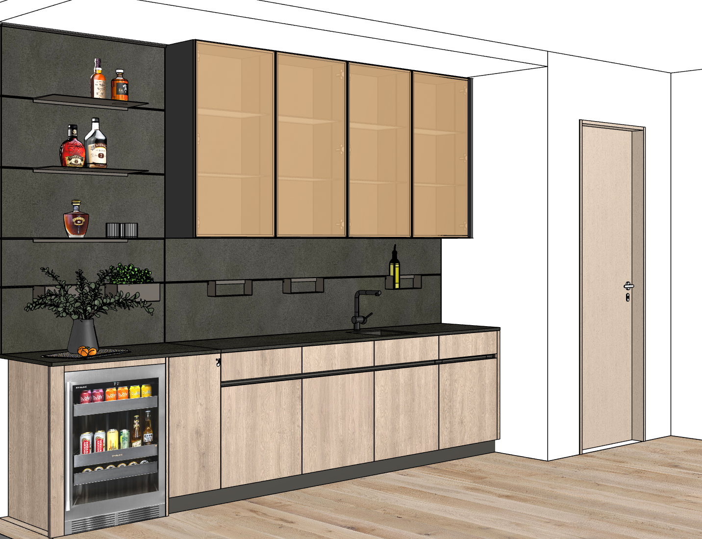 glass is high reflective with charcoal minimal metal trim countertop and wall panels are matt basalt like stone
