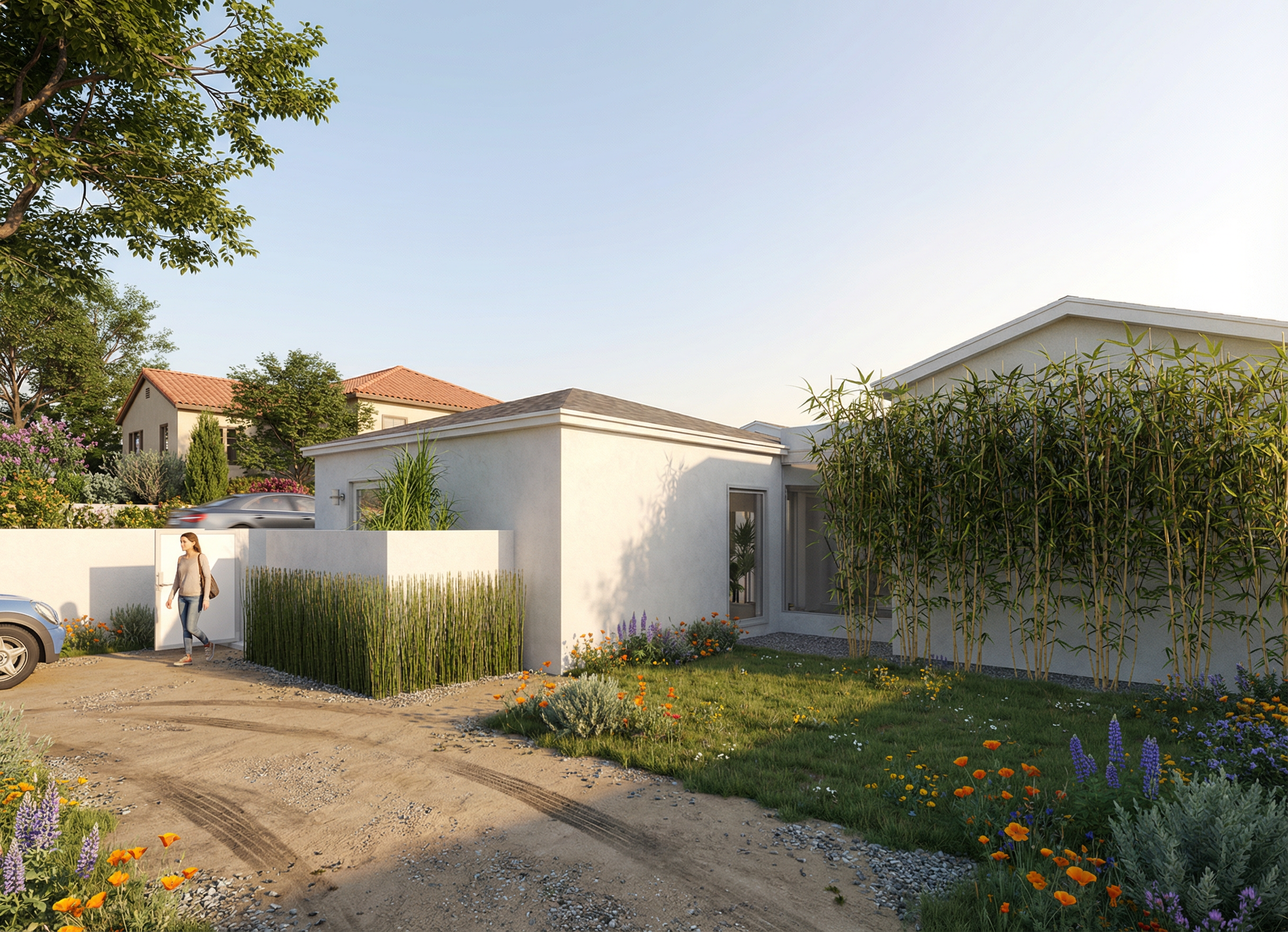 add trees and plants on the other side of the wall add some california wild flowers to the yard afternoon sunshine lighting up the small courtyard space add a woman walking through corridor inside the glass corridor