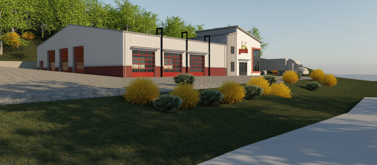 add few trees in background and far background for context and some few vegetation add warm interior lighting dim add only 2 small recessed circular lights above each balcony balconies only they should be evenly and neatly spaced