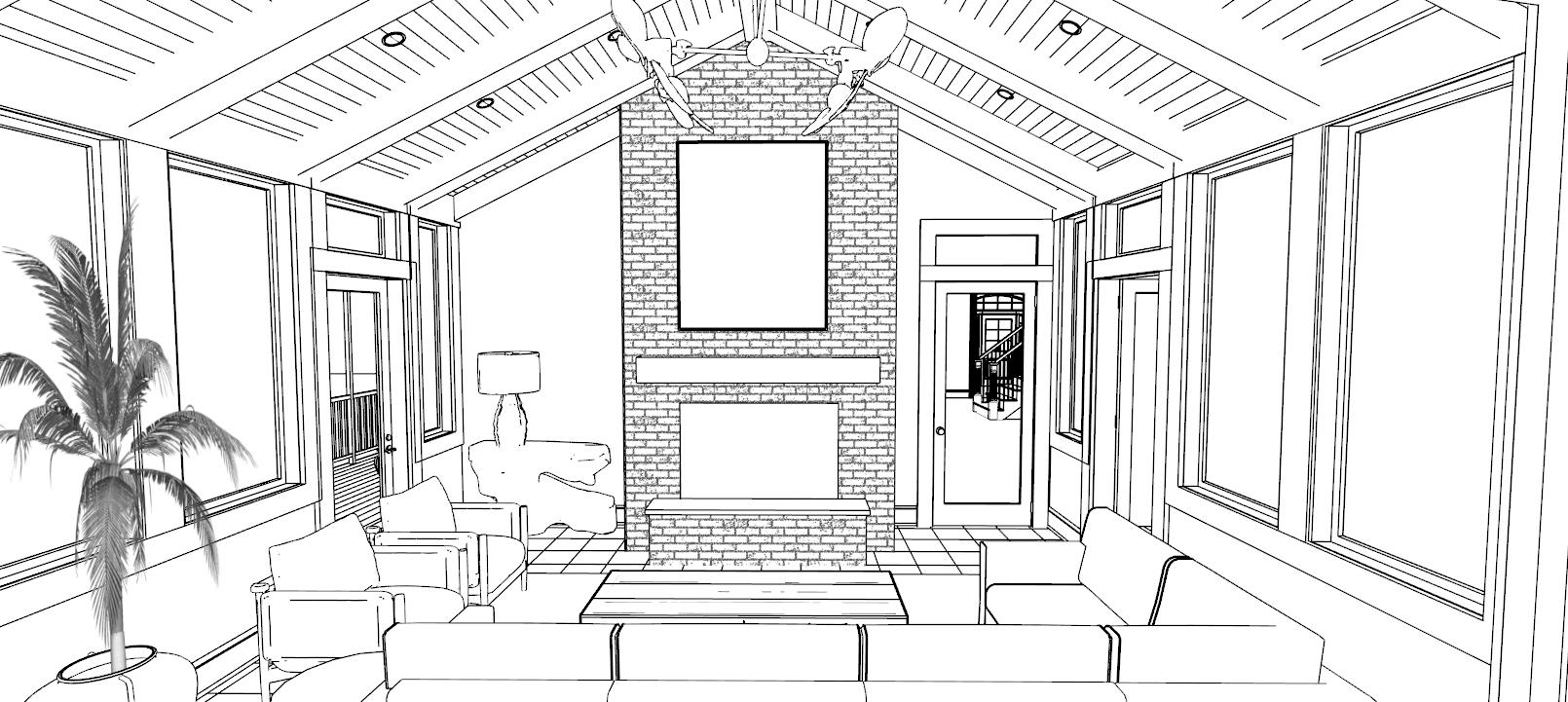 exterior shot limewashed brick fireplace sailboat artwork over mantel burgundy wool rug on floor on top of broker stone tile bohemian influenced furnishings light blond wood ceiling