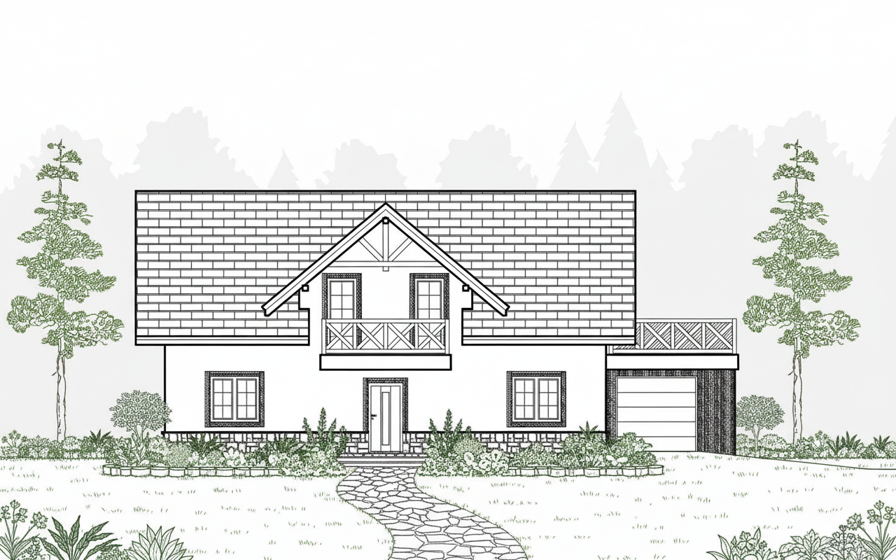 chalet style house with a stone base black shingle roof wooden windows with glazing bars wooden window trim beige plaster balcony with wooden balustrade black gutters and downspouts 2 lamps at the entrance stone walkway leading to the door stone driveway leading to the garage door