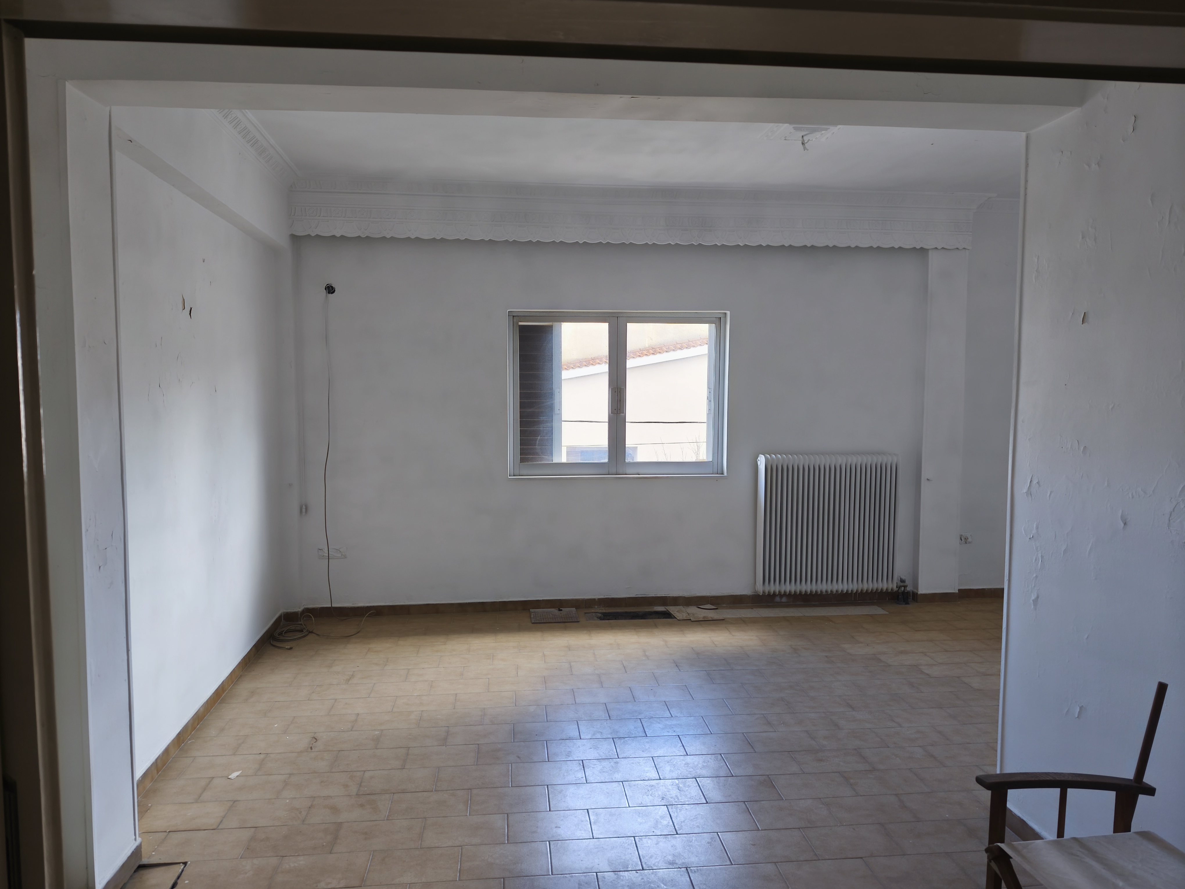 put a sofa on the right and a tv set on the left lets t make a bigger window and make it a glass door with curtains lets put a wood tile and pait the walls olive green