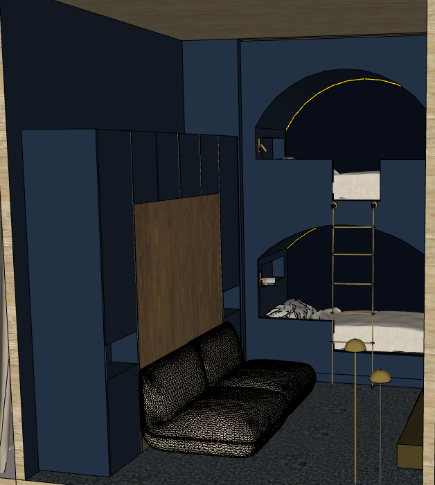 generate a realistic view of this kids room with customized bubk bed and low beige sofa the floor is carpeted in a blue and gold fabric the ceiling is made buy wood and the back of the sofa is a wardrobe made by wood noyer and painted all the walls in the room are painted in the same dark blue as the fournitures to create a design visual finish the bed part of the bunk are lighted by led on the inside the lights and ladder are in gold finishes