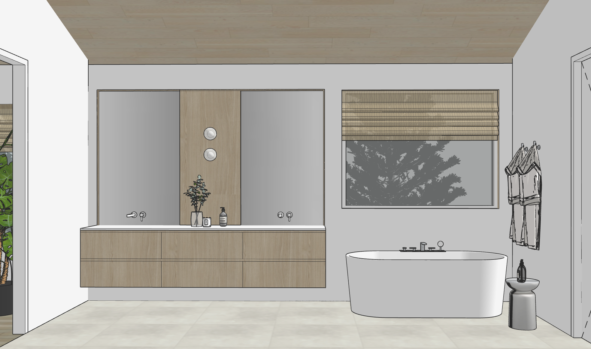 evergreen trees outside the window behind tub