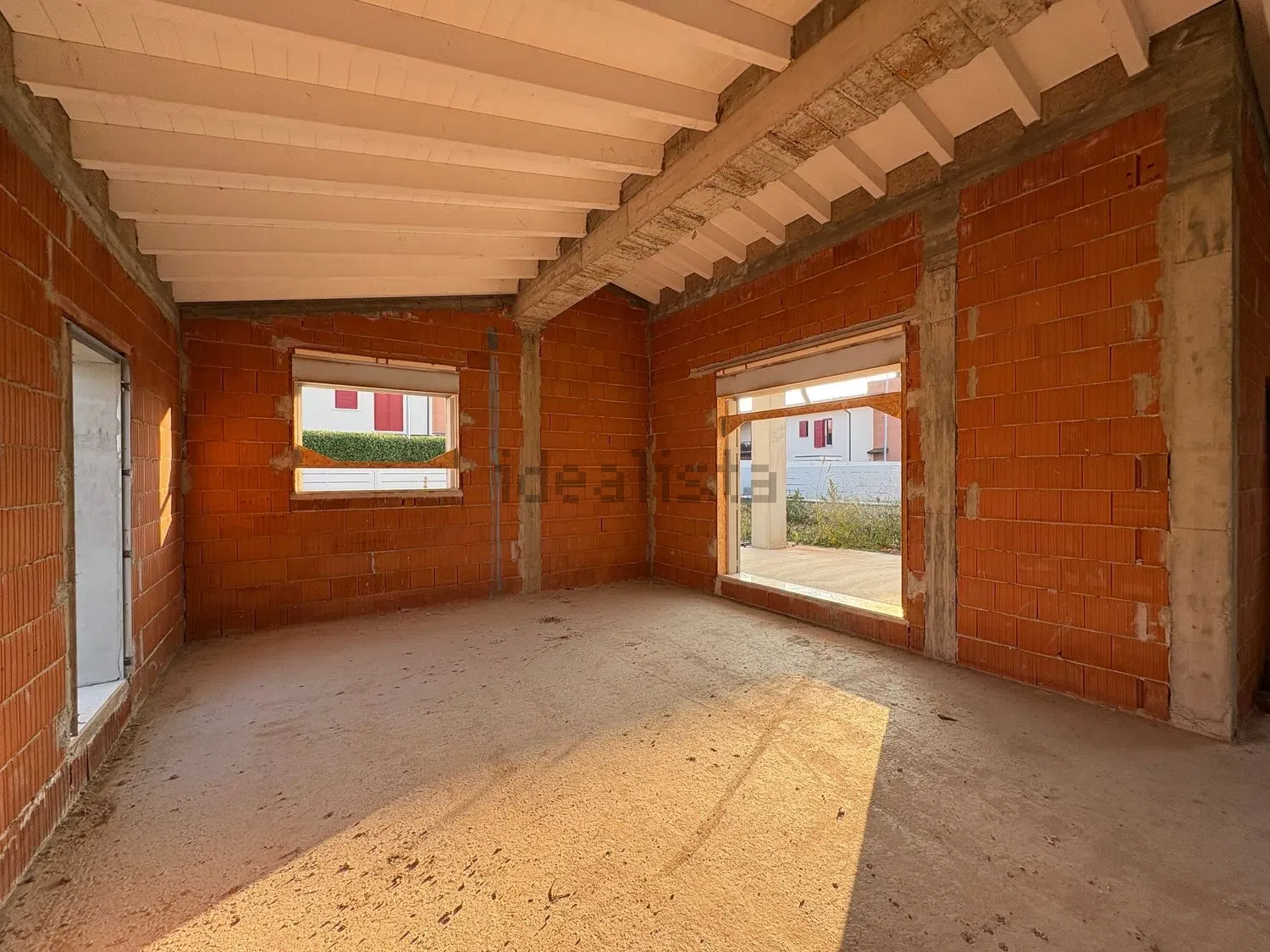 modernist interior shot mantieni inquadratura mantieni architettura inserisci pavimento in legno muri bianchi soffitto con travi bianche architecture