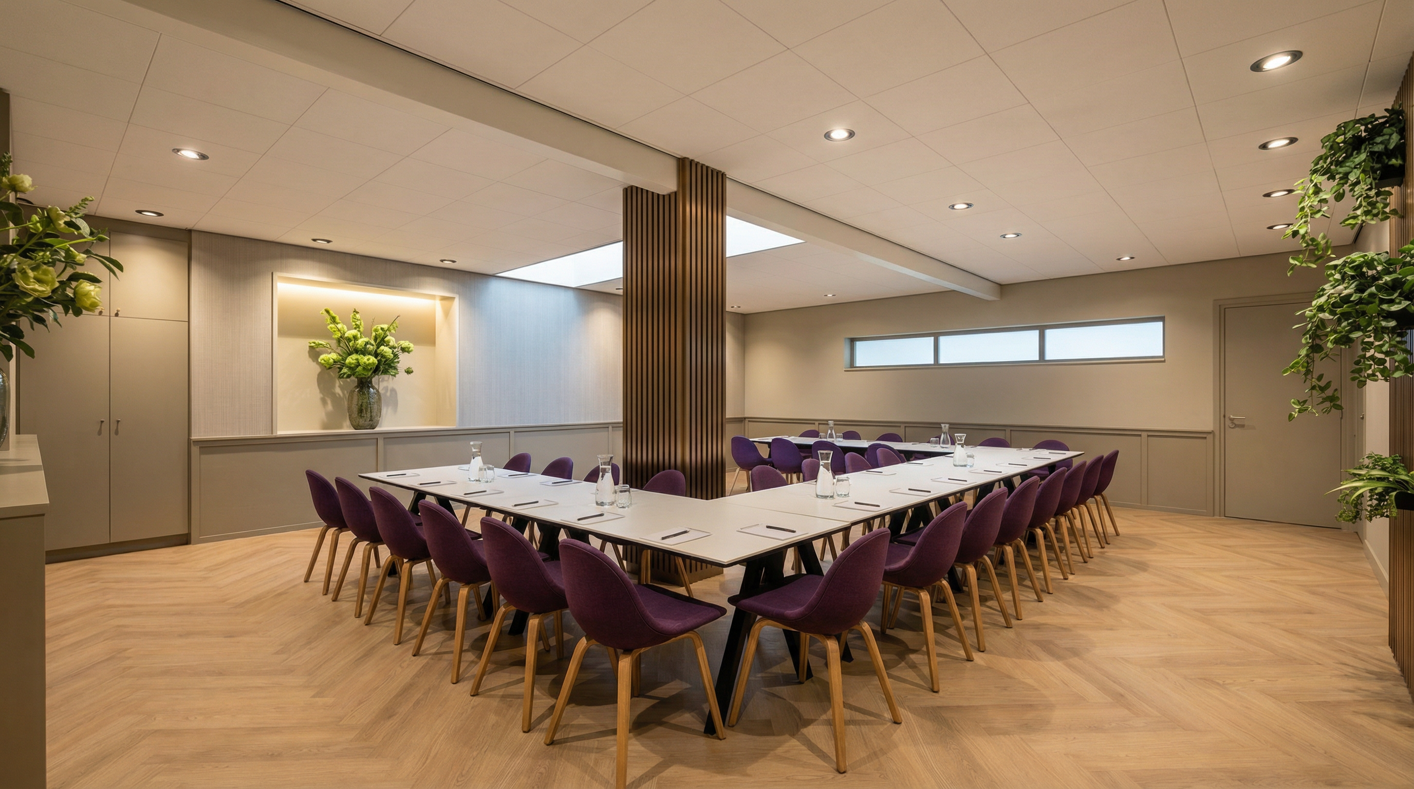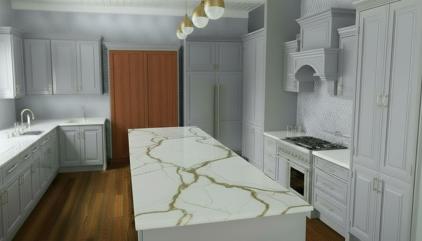 create a modern kitchen interior with a luxurious atmosphere use soft blue cabinetry throughout complemented by gold accent handles the center island features a white marble countertop with elegant gold veining the walls are adorned with a subtle gray pattern enhancing the sophisticated feel include warm rich wooden flooring to add contrast and depth to the space hang a row of sleek gold pendant lights with white globes above the island to provide a warm glow the overall atmosphere should be elegant and inviting make the double doors on the opposite end of the room a rich wood color similar to the floor color
