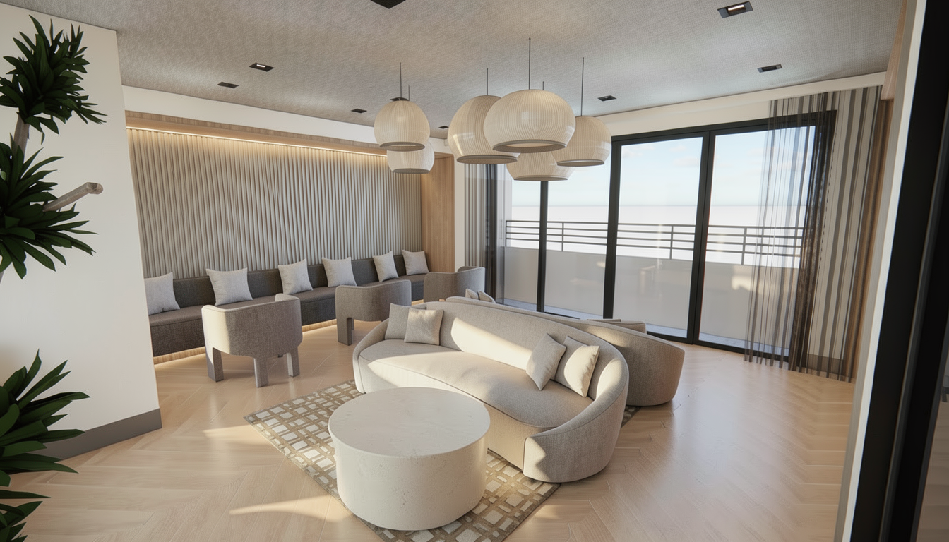 photorealistic high resolution interior polished concrete floors white and orange and grey graphic walls around kiosks on center with overhead lit up glowing signage and people sitting on benches the space is lit up with soft ceiling soft lights ceiling perforated metal orange panels that glow light in the center of the ceiling bright warm lighting and overall environment is soft bright lighting overall mood is warm soft lighting