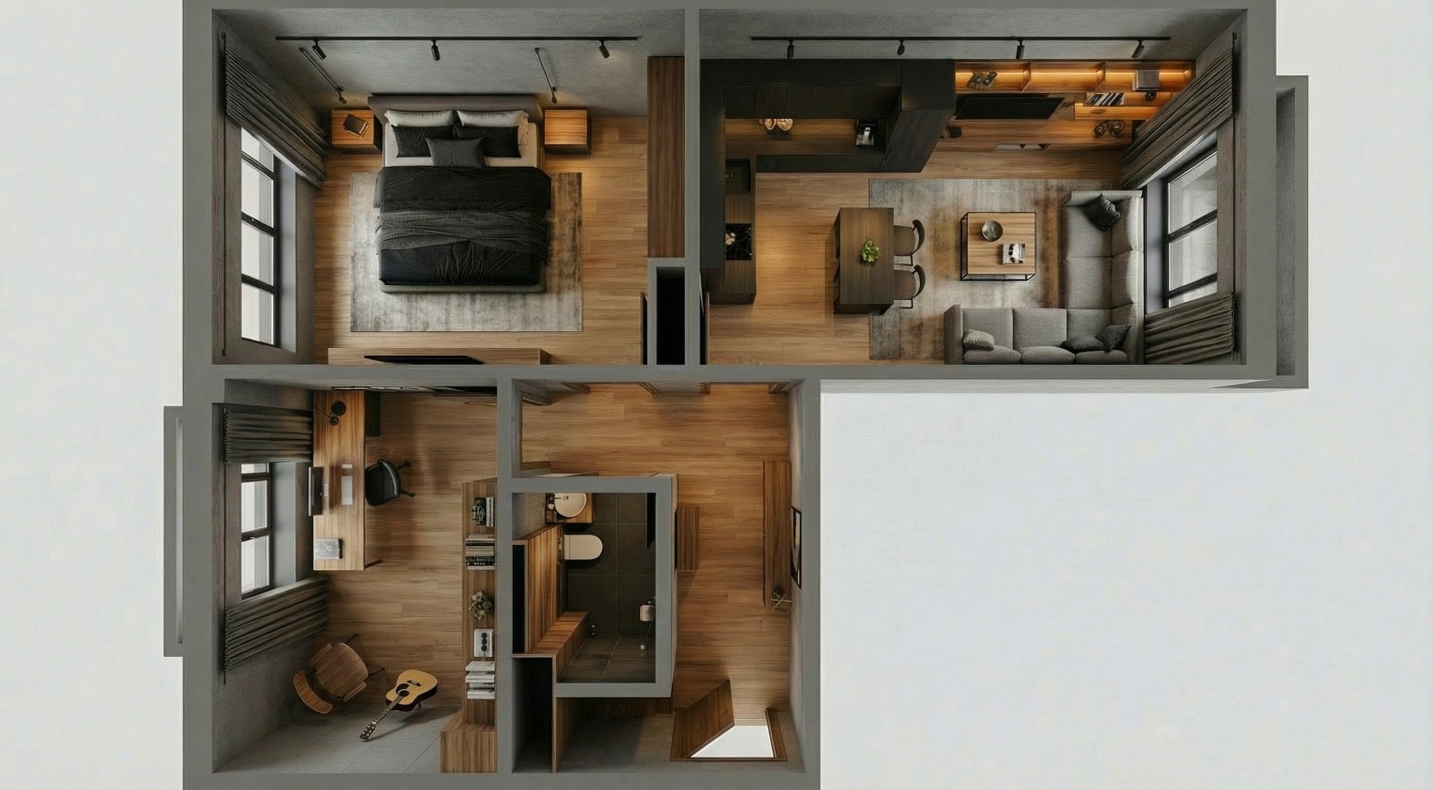 use the reference image it is a top view plan of an apartment i need an exact match elevation of the office which is sthe bottom left room in the image only the office render as if camera is at the top wall near the room door looking towards the opposite walls with all the provided furniture in sight use only the furniture from the reference image render the bookcase up to the ceiling