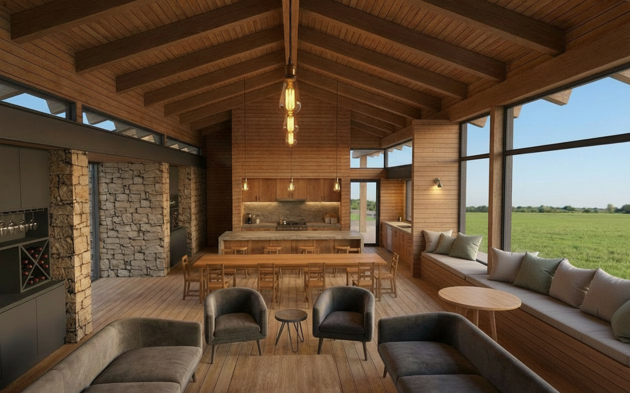clean timber clad architectural exterior rendered in cinematic lush morning lighting a little bit of asphalt around the building warm horizontal cedar tongue groove wood siding with minimal grain pattern grass foreground black standing seam metal roof visible lush forest landscape in the background natural wood textures high fidelity photorealistic visualization crisp shadow falloff refined facade geometry richly detailed grain patterns soft atmospheric depth premium architectural photography mood ultra clean composition and materials