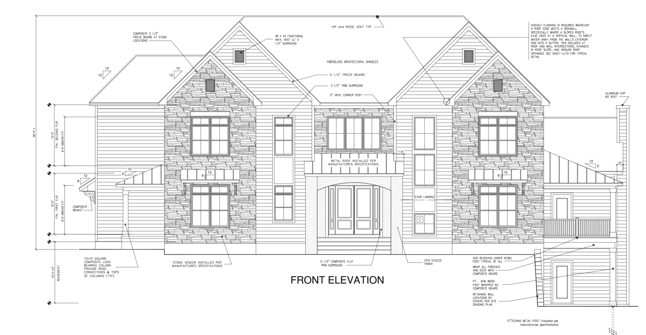render this house with sandstone and color catches facade metal roof on porch areas as noted and ashphalt shingle on the other noted areas please keep in mind that the right side of the home features a walk out basement so that that grade in to consideration