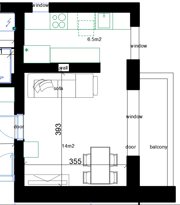 convert this floor plan into a realistic isometric 3d view of a full house show the space from an elevated angle with furniture walls and details visible this is a floor plan of a living room and kitchen make a 3d interiour visualization based on the floorplan layout walls are solid black furniture should be exactly like it is in floor plan doors and windows are anotated in text use the same furniture as shows on the plan do not change the orientation of the floorplan