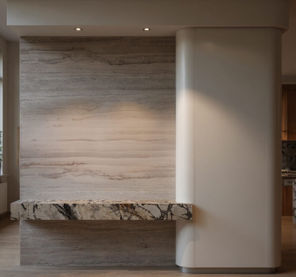 alvar aalto interior shot remove travertine wall from above and below the shelf change that wall above and below to a white textured wallpaper change the stone shelf to a light taupe travertine change the floor to a white polished floor architecture