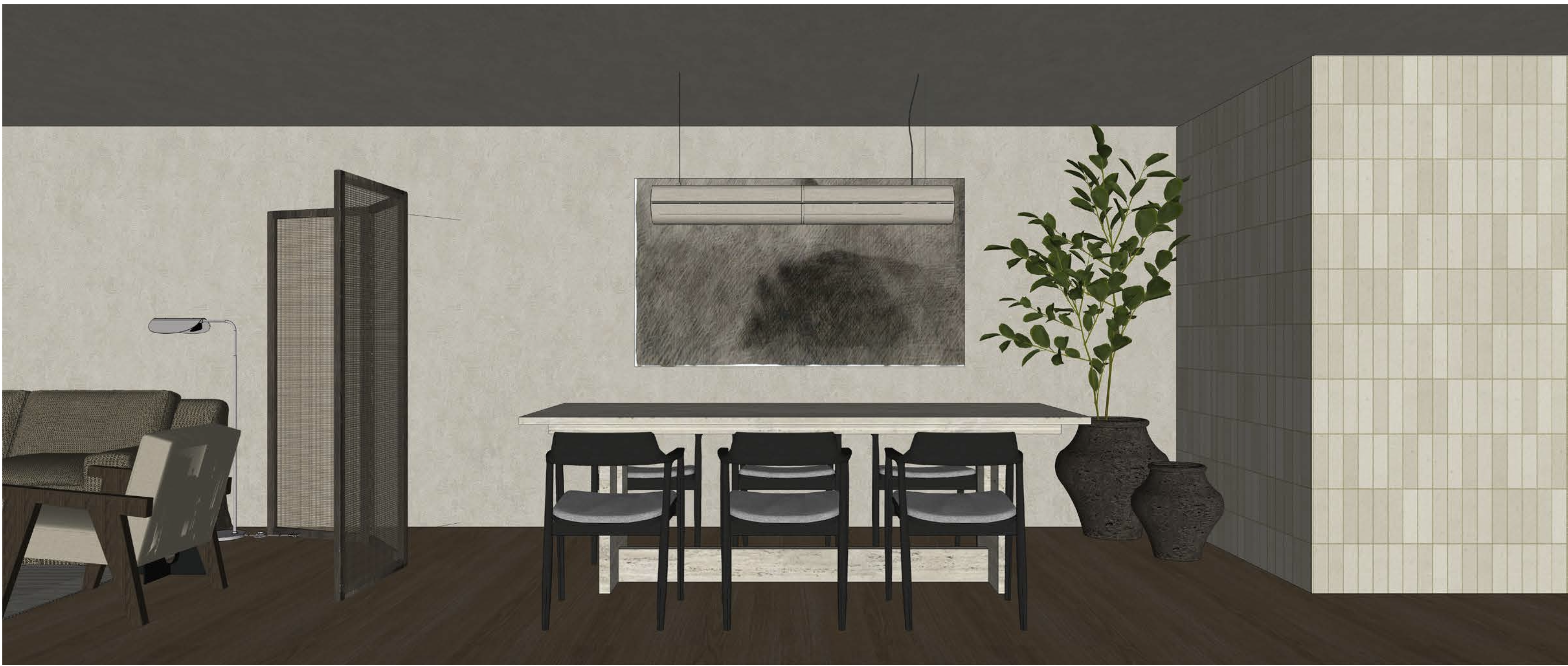a modern minimalist interior featuring a dining area the walls are a subtle cream color with a textured finish chukum adding warmth and depth a sleek dark wood dining table with matching chairs stands out against the rich dark brown wooden floor above the table a contemporary metallic pendant light hangs gracefully a lush green plant in a dark textured vase adds a touch of nature and freshness to the space the ceiling is the same sand paste chukum as the walls creating a cozy and sophisticated ambiance the overall atmosphere is tranquil and elegant with neutral tones and natural elements harmonizing perfectly the wall on the right is a hand made tile in sand color