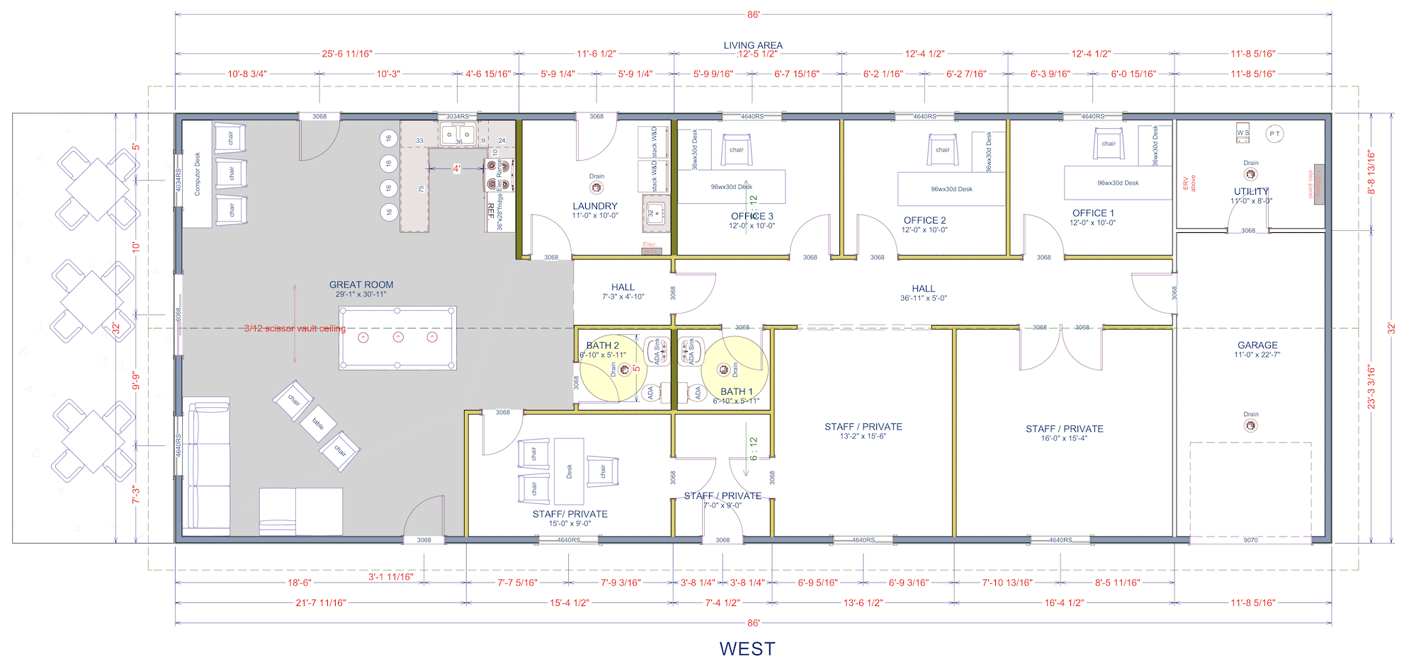 convert this floor plan into a realistic isometric 3d view of a full house show the space from an elevated angle with furniture walls and details visible this is a community center main building wired to code with 2x2 or 2x4 surface mount led fixtures make the exterior white board and batten and interior drywall painted white use the same furniture as shows on the plan do not change the orientation of the floorplan