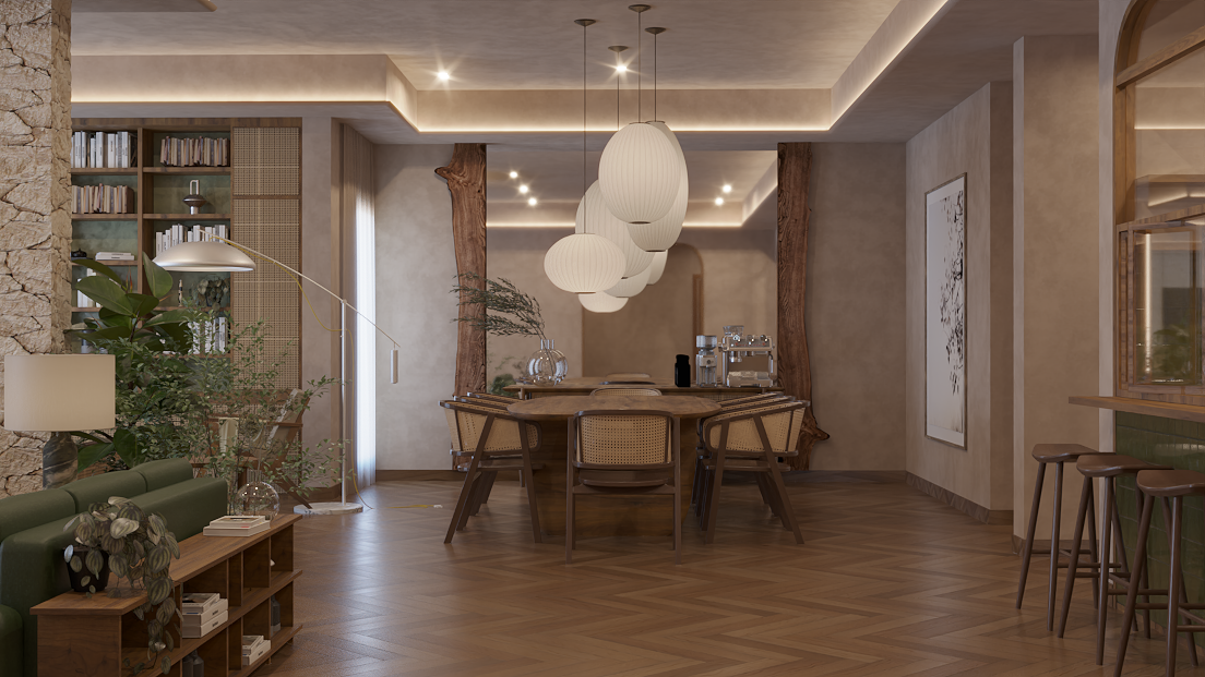 render a photorealistic 3d perspective of this interior living room with natural sun light from the window and see thru beige curtain bohemian style and organic fresh color visualization quality 8k resolution tv wall same material keep the spot light in ceiling add hidden light on the ceiling border