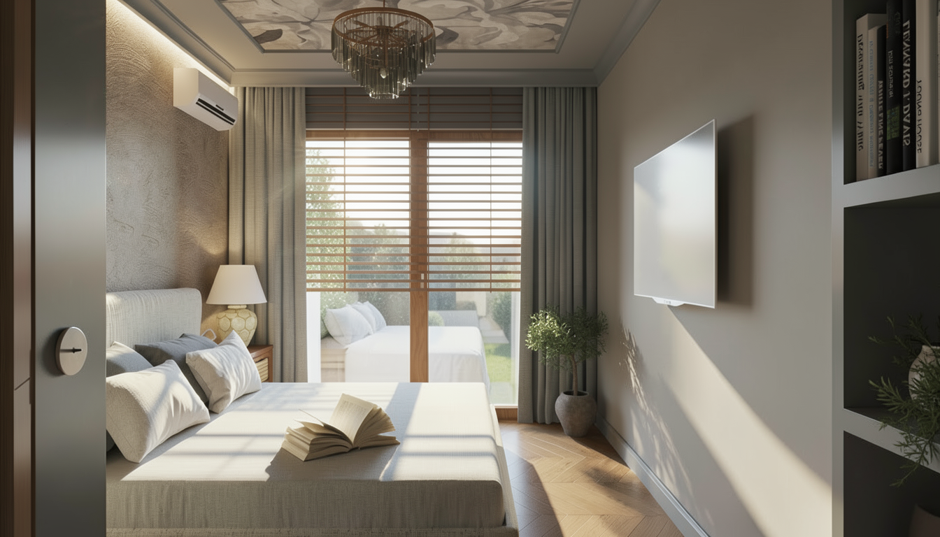 luxurious rustic mountain chalet surrounded by lush evergreen trees and shrubs nestled against a dramatic rocky landscape the chalet boasts dark wood walls and stone accents featuring floor to ceiling windows reflecting the subtle glow of warm indoor lighting in the background majestic snow capped mountains rise against a cloudy sky casting gentle shadows the atmosphere is serene and cozy with a soft diffused light suggesting either early morning or late afternoon soft greens of the grass and foliage add a natural contrast to the earthy tones of the rock and wood