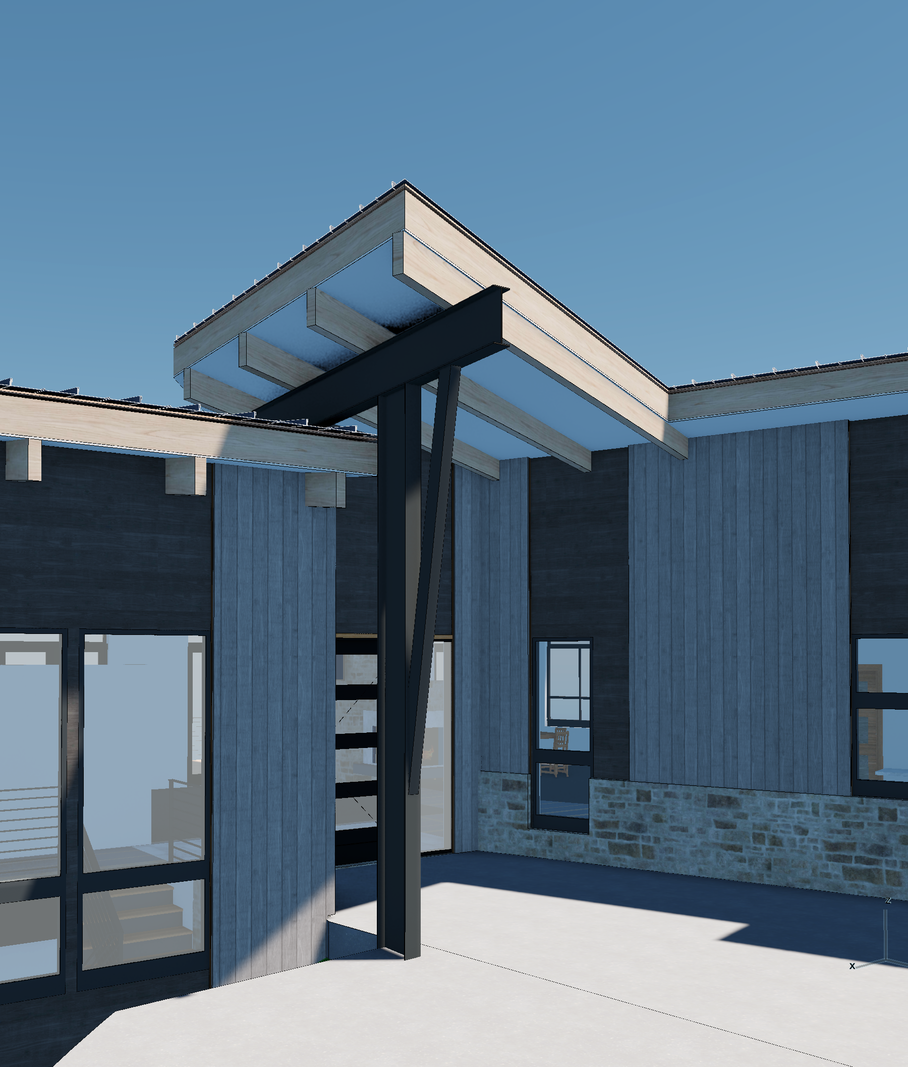 mountain modern ski home warm light emanating from the windows vertical siding in weathered wood brown areas and horizontal siding in black areas snowy pine forest around the home and distant low mountains alpine glow from behind the camera