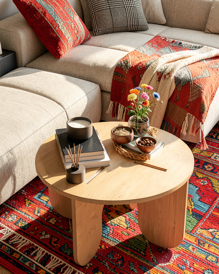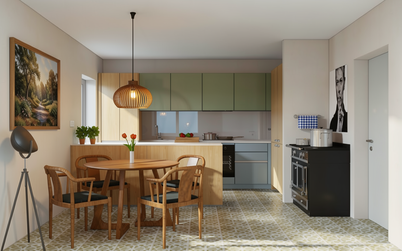 on the left side is not a window but a passage and on the left wall hang a picture in the area above the wall units the ceiling must be brighter and under the table set a round modern carpet the carpet is to big please smaller the carpet cannot let under the kitchen island