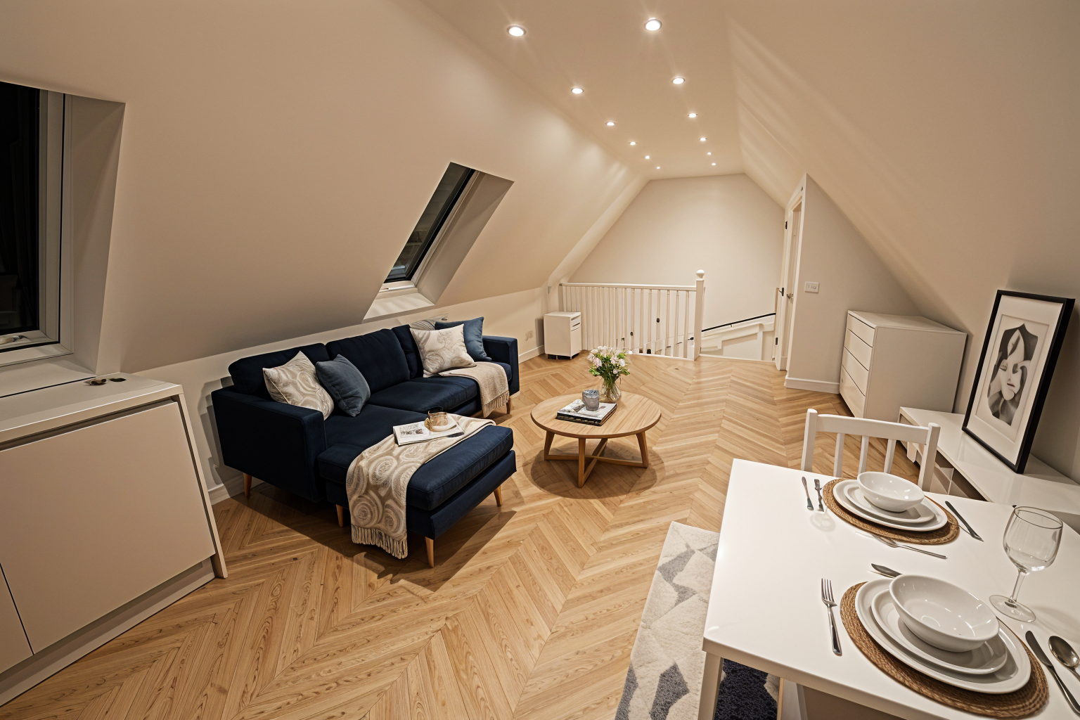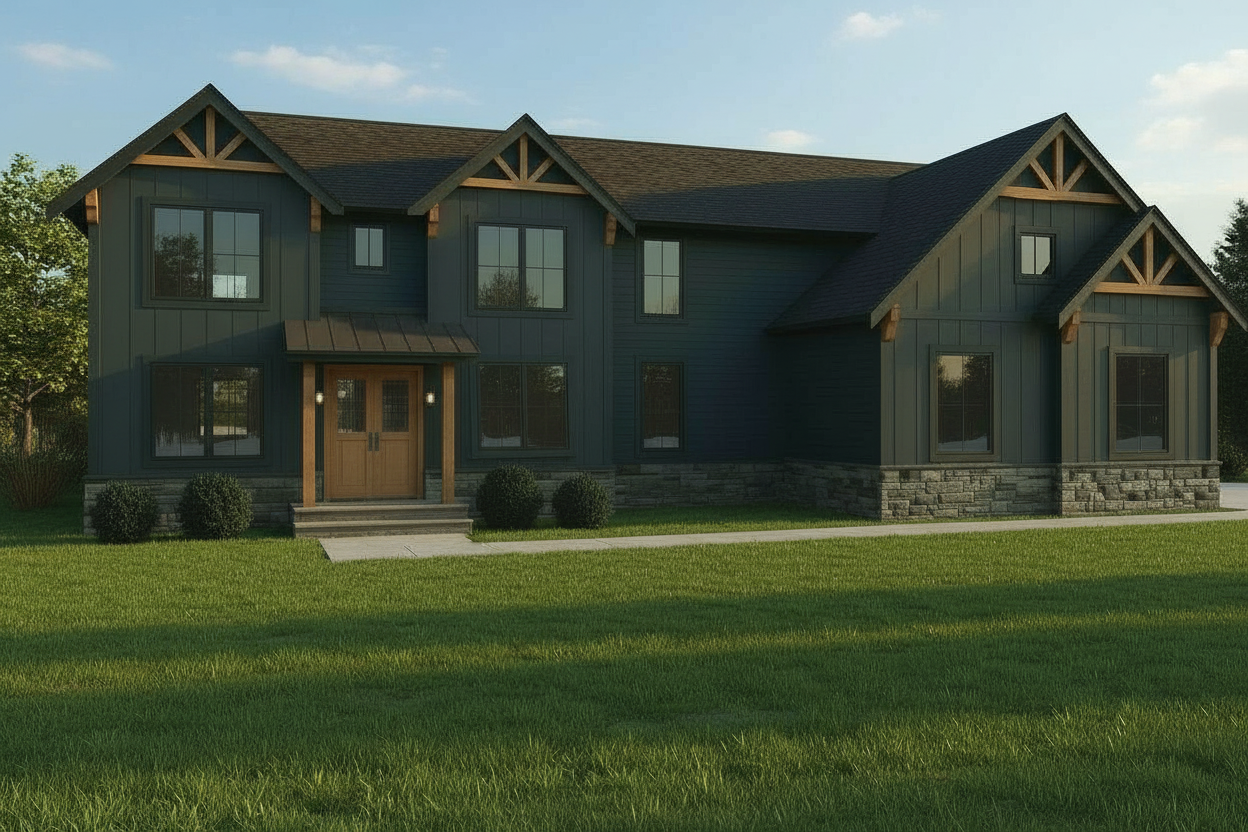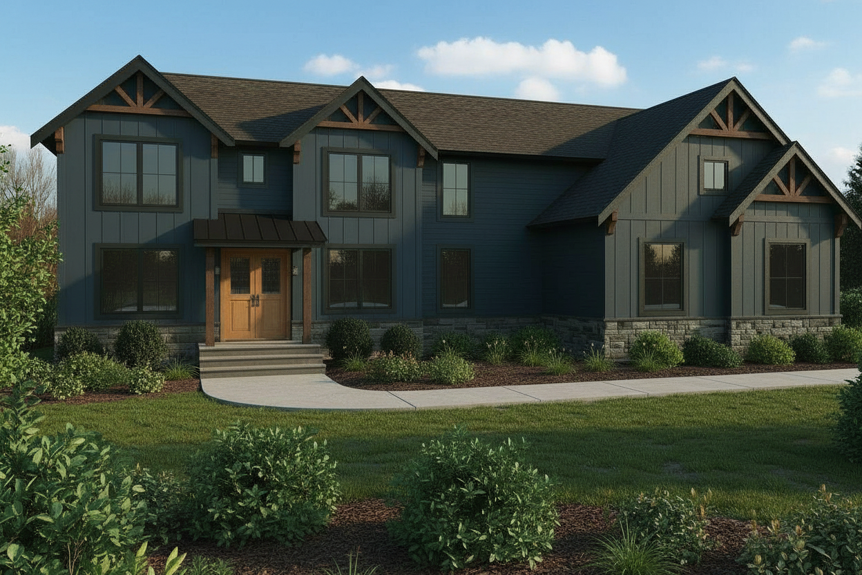 dark blue siding black windows with black trim sidewalk going from front stairs to the right