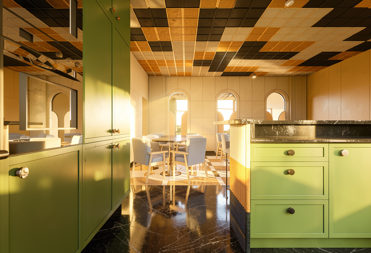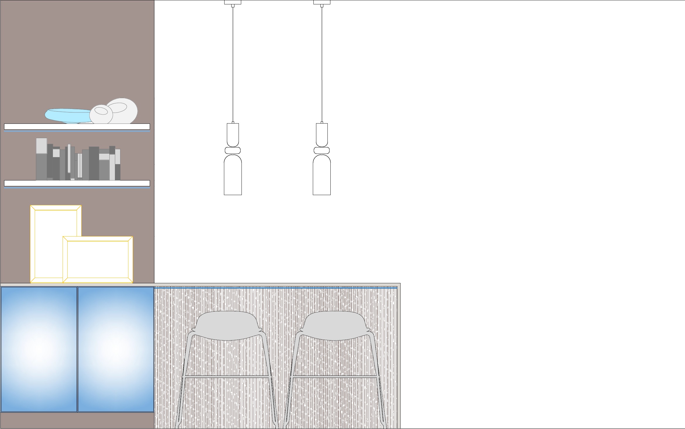 pogled ka sanku sank u visini 90cm duzine 130cm sa dve barske stolice radna ploca i bocna ploca kamen calacata gold udubljenje za stolice od drveta i skrivena rasveta sa radne ploce baca svetlmo na drvena ledja sanka desno do sanka dvokrilna komoda sa ogledalima na frontovima iza komode je zid bez boje na kome su dve drvene konzolne police sa skrivenom rasvetom