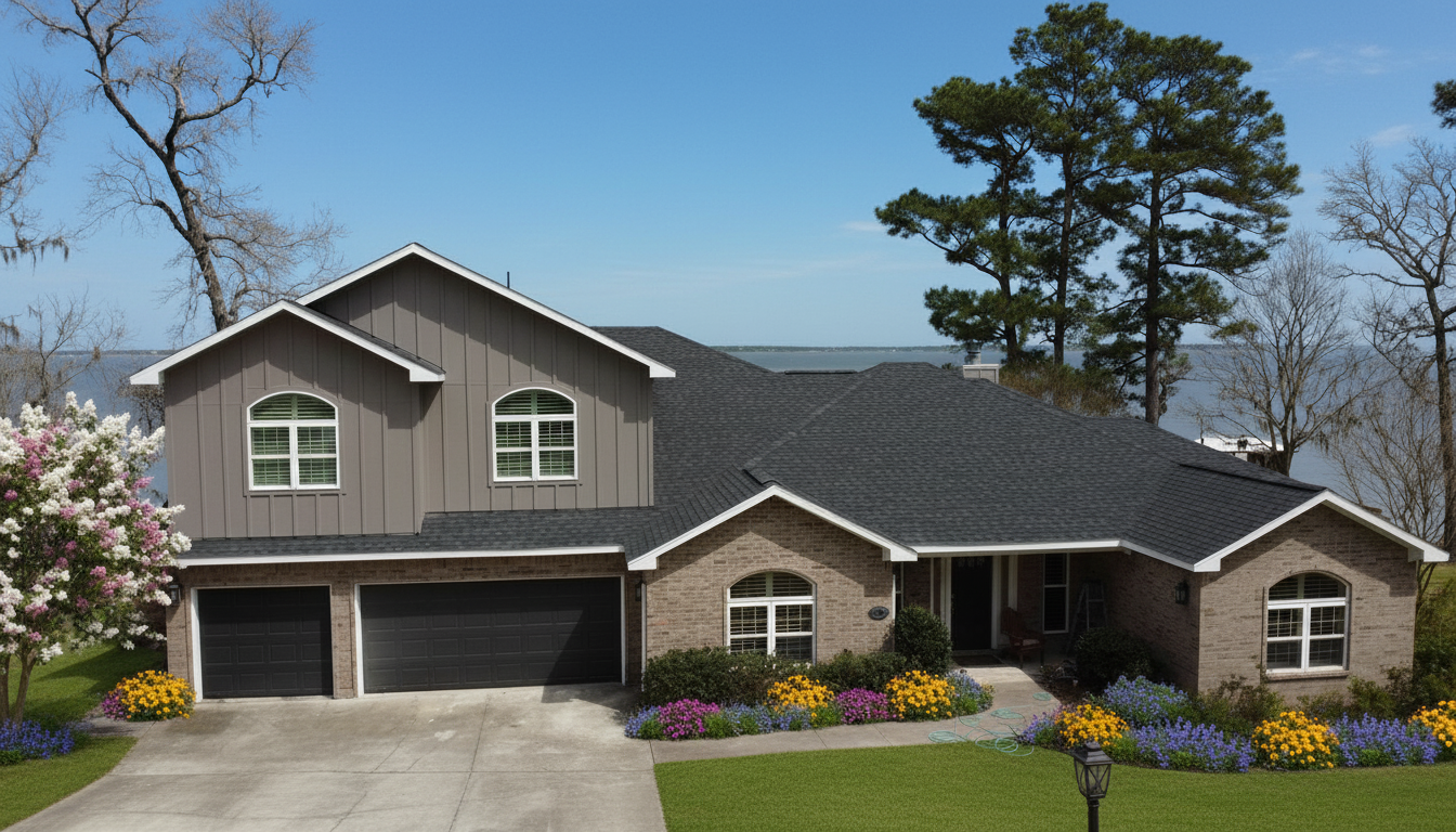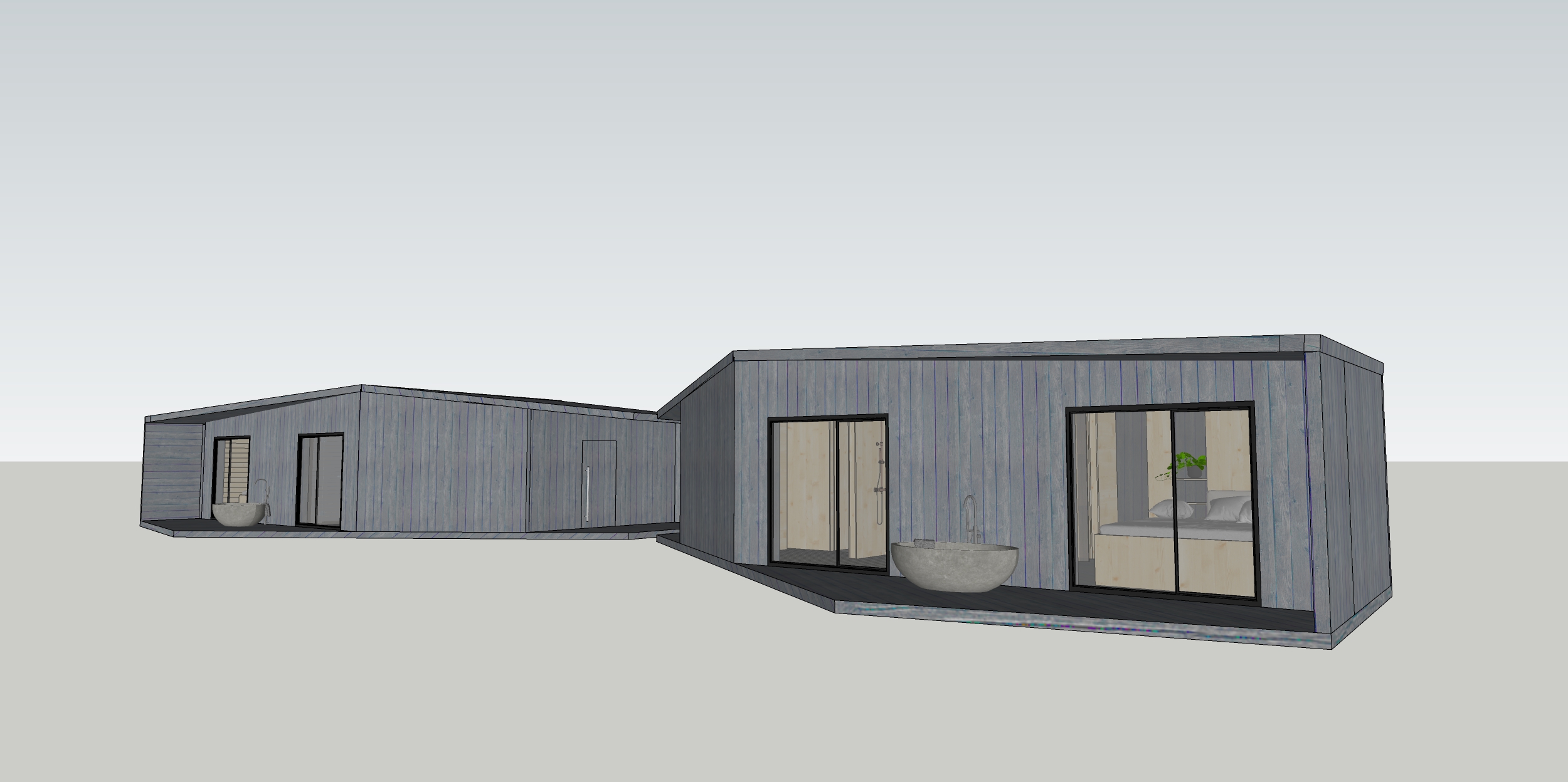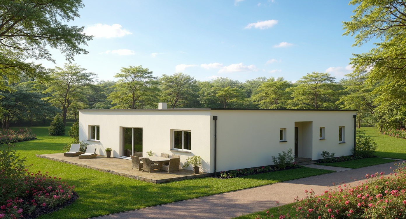 modernist exterior shot a beautifully rendered modern minimalist house set amidst a serene natural environment the house features wooden structures with a dark gray and black exterior large glass windows reflect the subtle hues of the surrounding landscape the wooden siding has warm earthy tones like soft browns and is combined with sleek contemporary black trimming the atmosphere is tranquil and the lighting is soft mimicking a gentle morning or late afternoon light the ground is adorned with patches of green moss and vivid yellow wildflowers adding a burst of color and life the surrounding trees are leafless drawn with delicate thin black lines indicating the late autumn season shadows of the trees create an intricate pattern on the house and the ground in varying shades of gray and brown the entire setting feels both modern and natural embracing simplicity and elegance architecture