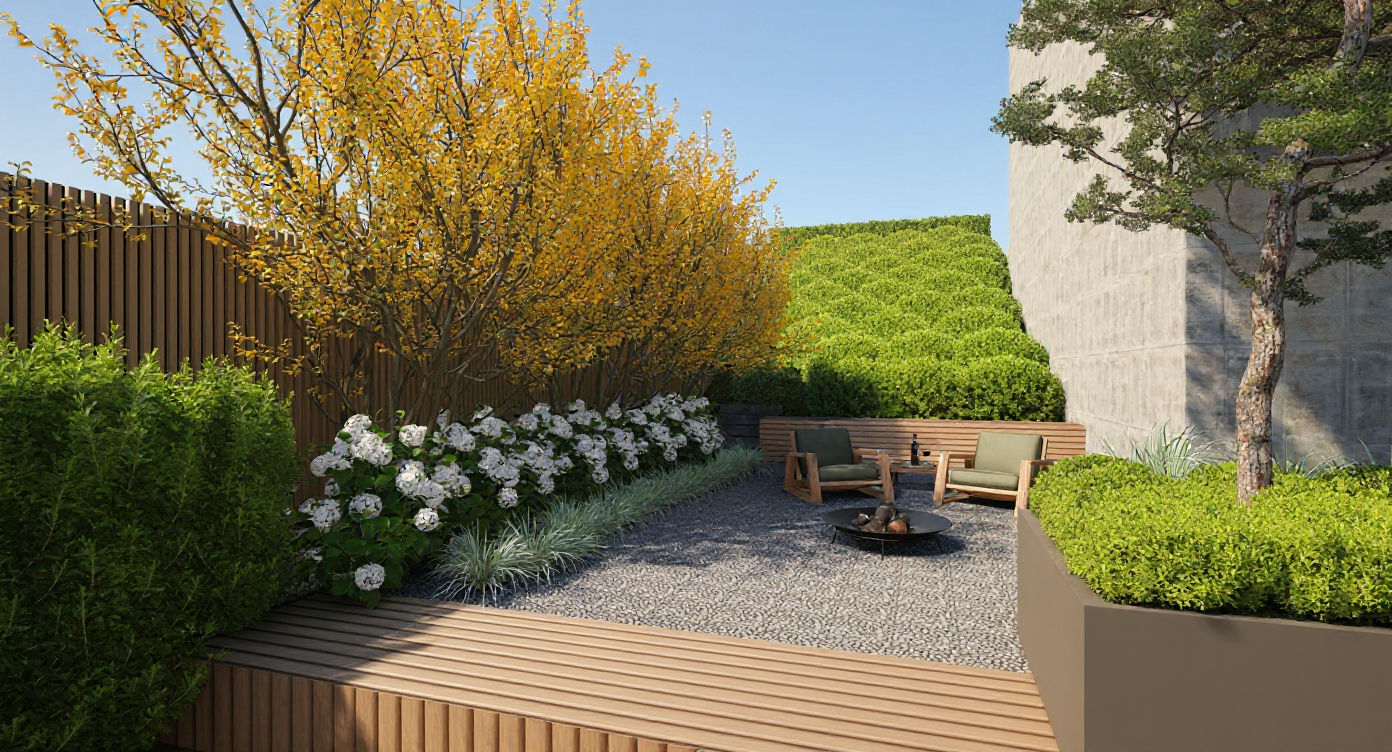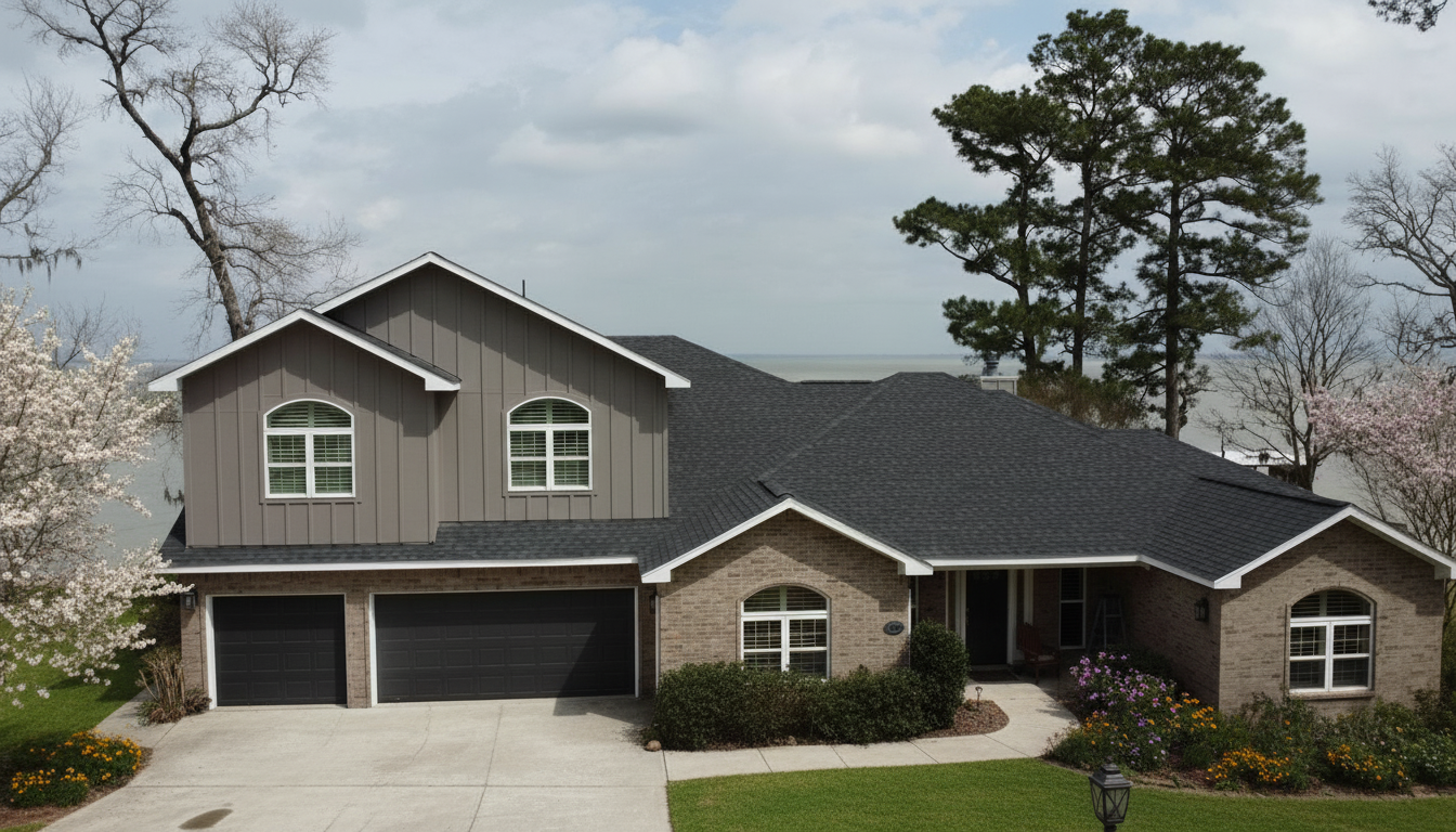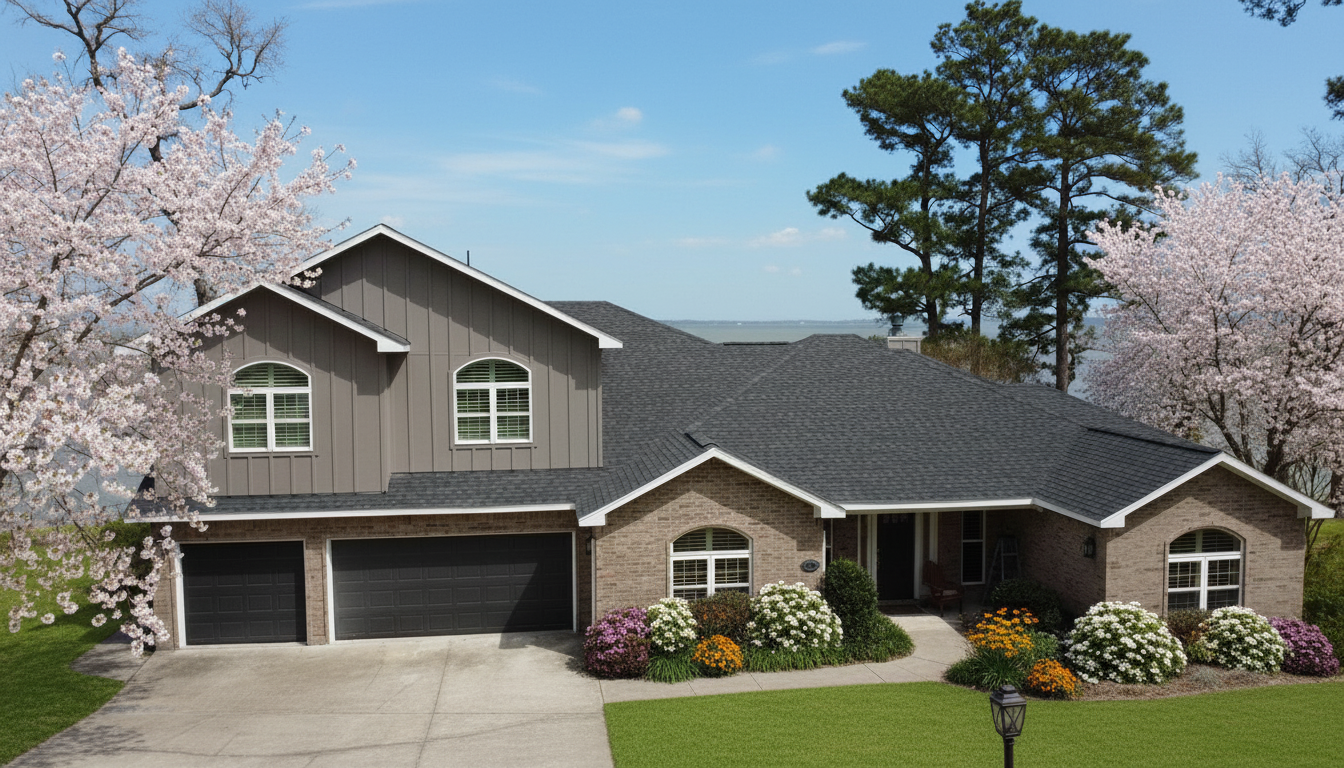 modernist exterior shot a beautifully rendered modern minimalist house set amidst a serene natural environment the house features wooden structures with a dark gray and black exterior large glass windows reflect the subtle hues of the surrounding landscape the wooden siding has warm earthy tones like soft browns and is combined with sleek contemporary black trimming the atmosphere is tranquil and the lighting is soft mimicking a gentle morning or late afternoon light the ground is adorned with patches of green moss and vivid yellow wildflowers adding a burst of color and life the surrounding trees are leafless drawn with delicate thin black lines indicating the late autumn season shadows of the trees create an intricate pattern on the house and the ground in varying shades of gray and brown the entire setting feels both modern and natural embracing simplicity and elegance architecture