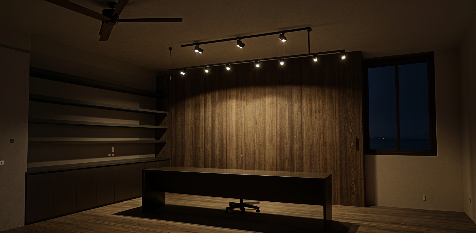 evening time lights on keep original floor white background keep the ceiling fan remove extra lights paint walls beige gray intense light linear light above the cabinet