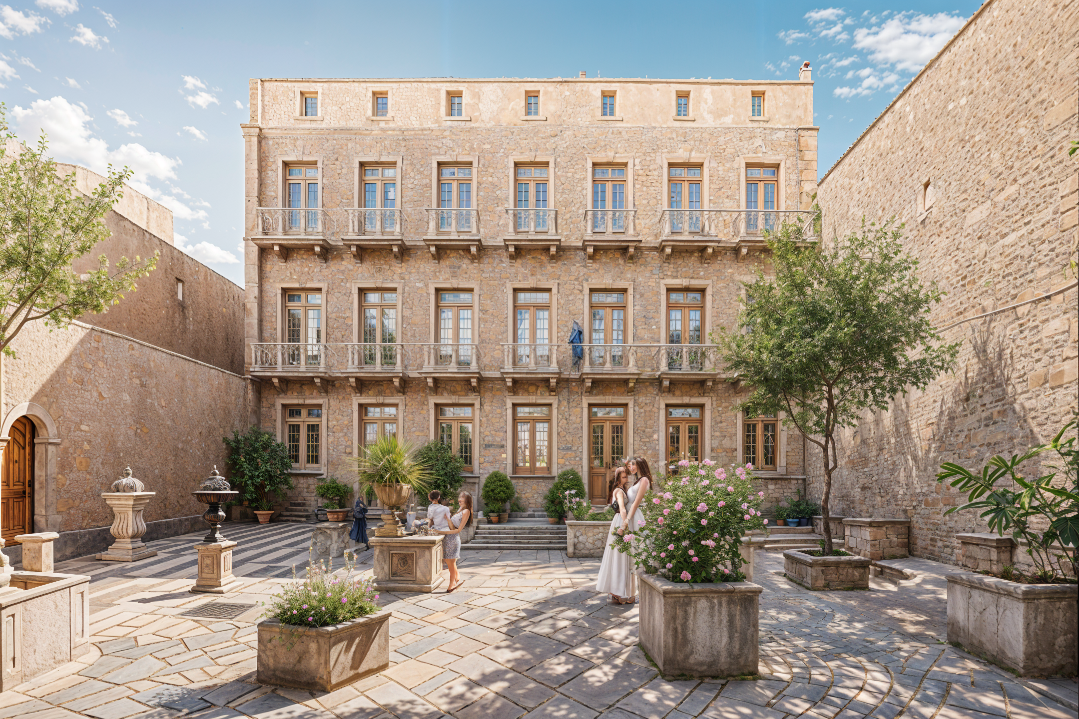 exterior shot a square courtyard with building in front green facade scultures and plants in the garden