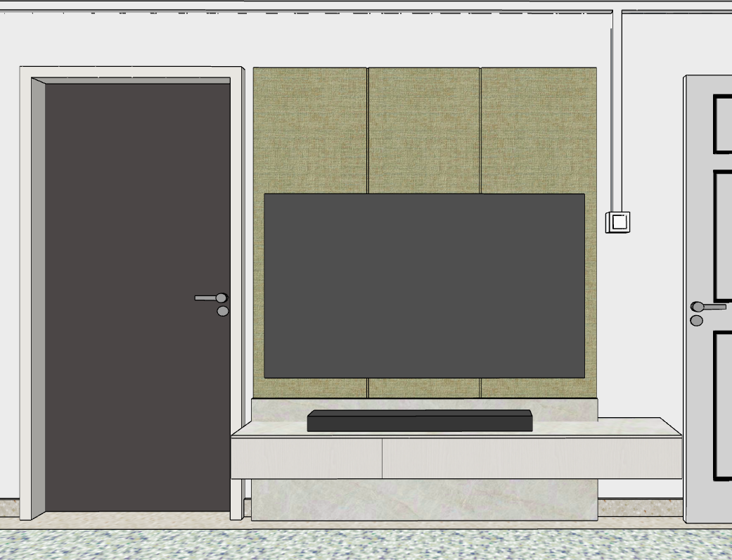 green gabric tv feature wall stone lieght biege countertop console with white drawers with wood greains