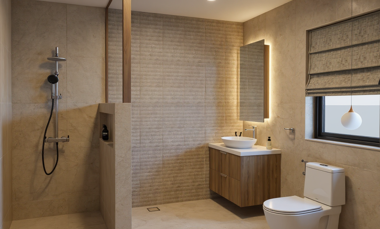maintain tile texture feature wall beside vanity beige tone floor and wall tiles with less grain pattern perimeter dim led light around mirror cabinet low intensity lower contrast matt finishing