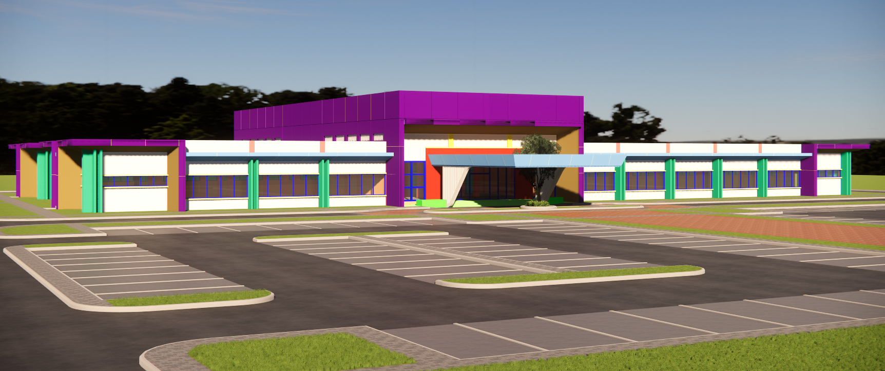 a wide angle architectural visualization of a modern two story corporate headquarters with a sleek white panel facade and rounded corners the building features massive floor to ceiling glass windows revealing a bright minimalist interior a large sweeping cantilevered canopy overhangs the main entrance supported by elegant v shaped pillars the foreground shows a clean asphalt driveway with professional landscaping featuring succulents ornamental grasses and manicured trees soft natural daylight clear blue sky high end 8k render photorealistic