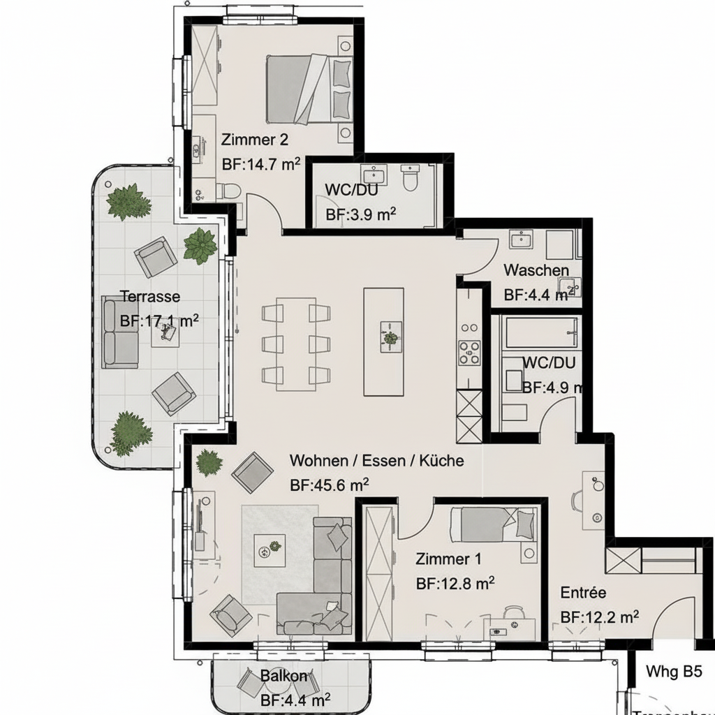 convert this floor plan into a realistic isometric 3d view of a full house show the space from an elevated angle with furniture walls and details visible a modern appartement with white walls wooden floors matte black elegant kitchen use the same furniture as shows on the plan do not change the orientation of the floorplan