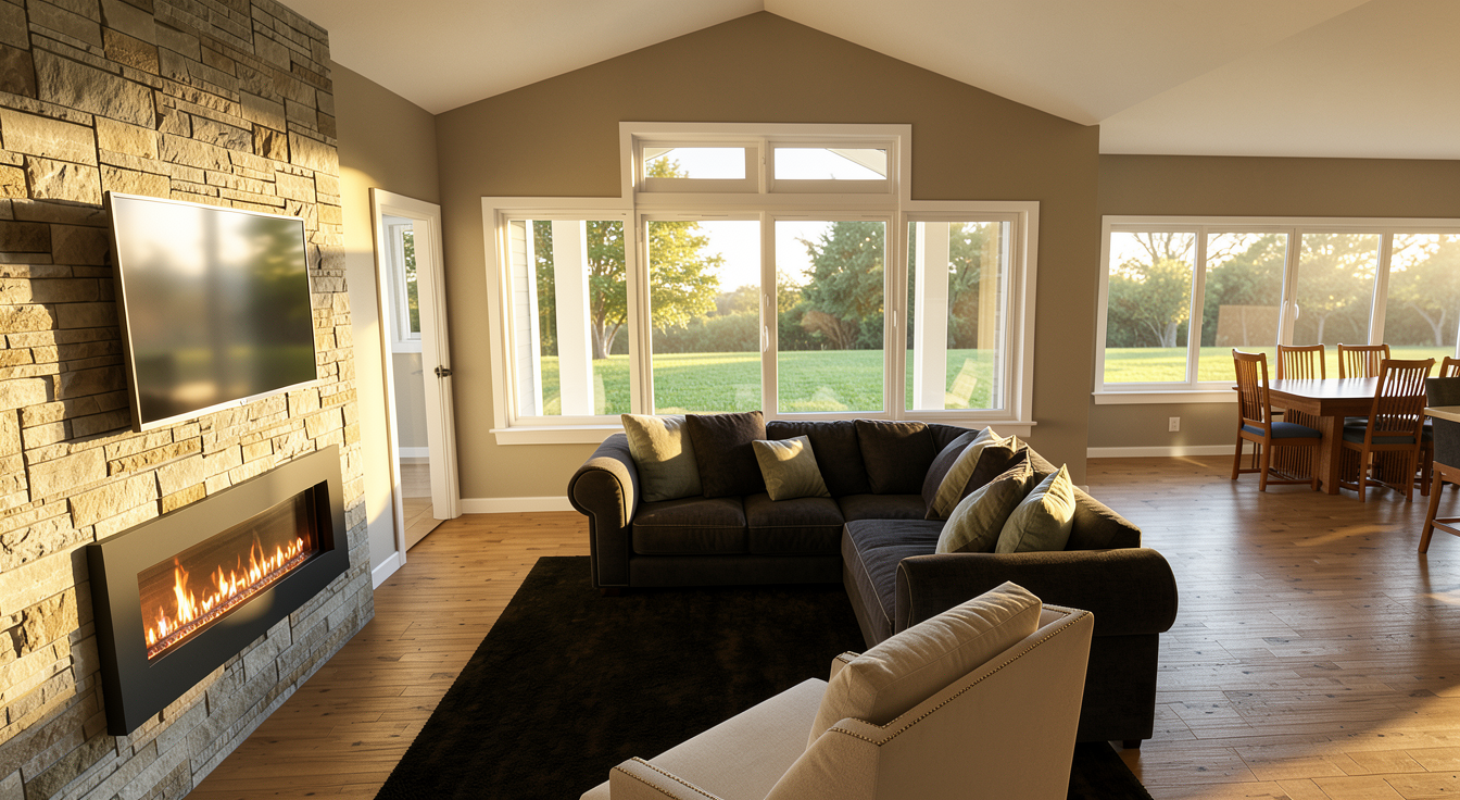 redesign this bathroom while maintaining the exact existing layout including the window placement toilet location and shower tub combination create a modern elevated bathroom with a warm neutral palette featuring creamy tones soft browns and subtle taupe the design should feel refined clean and timeless with a quiet luxury aesthetic incorporate large format oversized tile on both the floors and walls with minimal grout lines for a seamless spa like look include a 42 inch single sink vanity with an integrated makeup area directly adjacent to it the vanity should feel clean lined and custom in a warm wood or soft neutral finish use a warm creamy stone countertop as a focal point add a backlit led mirror above the vanity paired with soft elegant lighting such as wall sconces in a brushed gold finish update the shower tub combination with the same large format tile and a clean modern look include a minimal glass panel or refined enclosure all fixtures should be brushed gold with a warm tone no chrome or cool finishes ensure the lighting is soft and layered with natural daylight coming through the window the overall design should feel realistic buildable and professionally designed not staged or overly decorative prioritize accurate proportions realistic materials and architectural clarity avoid generic or overly styled interiors maintain correct scale and spacing based on the existing room