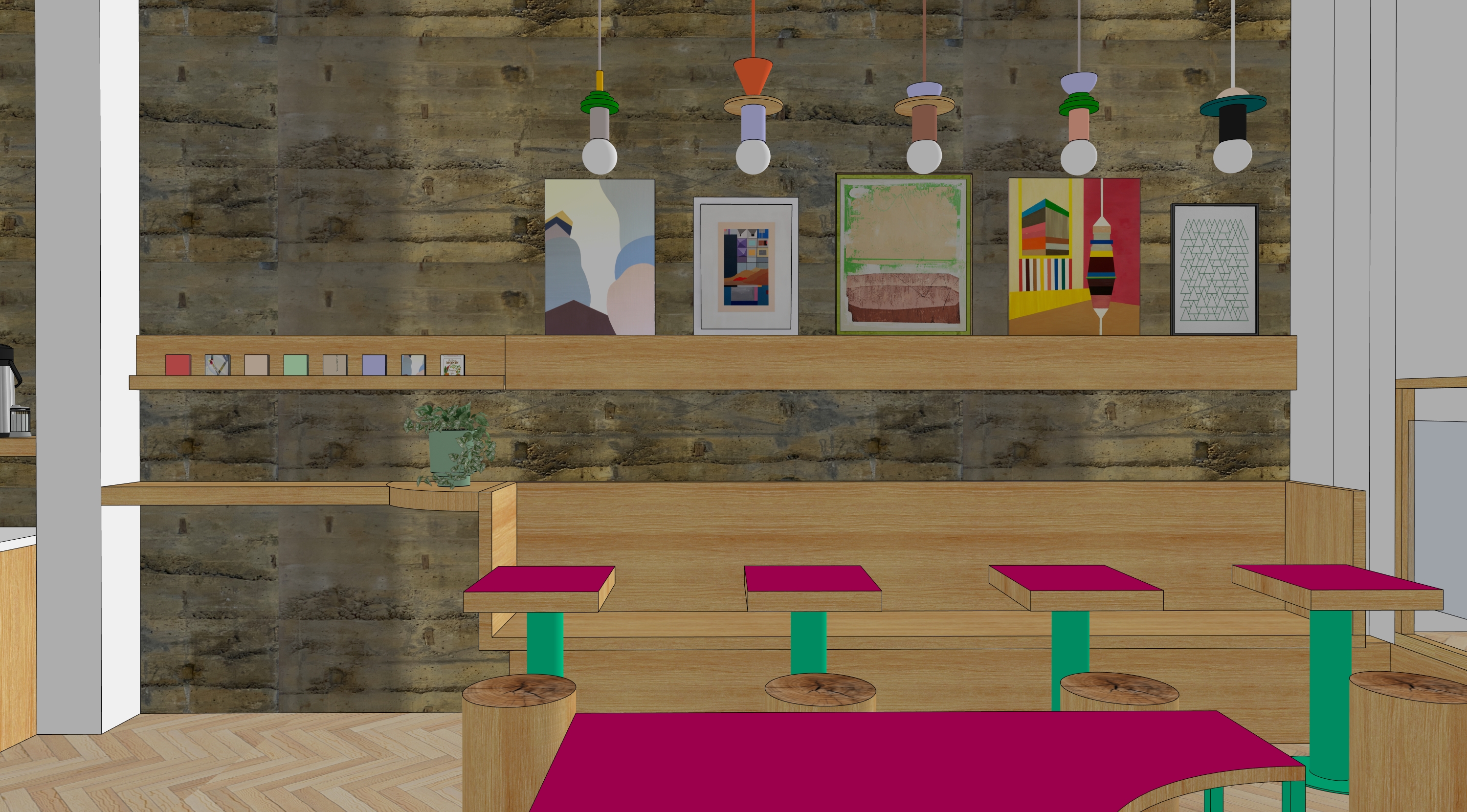this is an interior view of a coffee shop the furniture is oak and jade green powder coated metal the image has globe pendant lights which have a soft glow the space has soft natural light in it but do not render any surfaces as windows there are no windows in the view do not change anything about the structure of the image