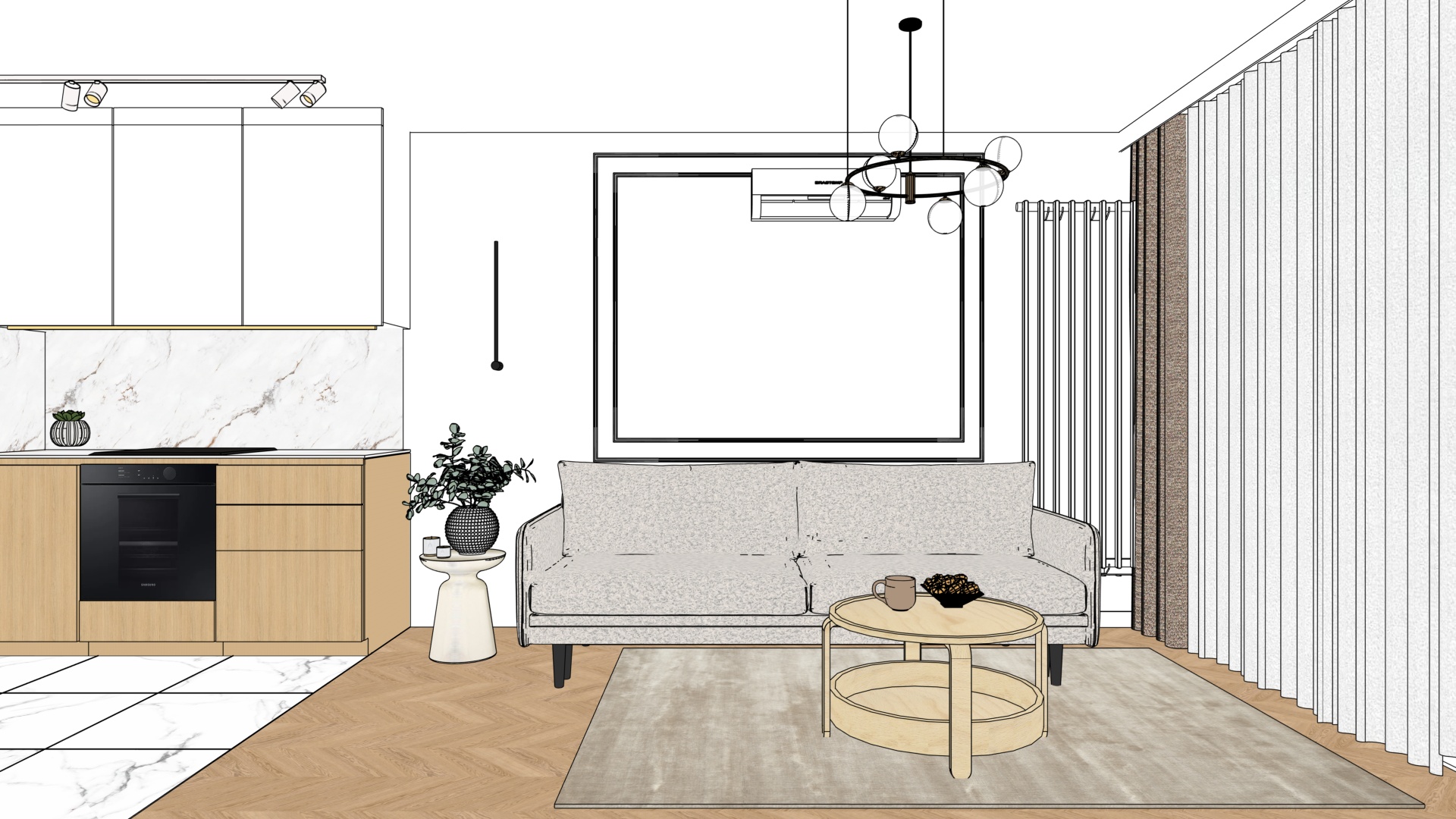 fotorealistyczna fotografia wn trza klasy premium projekt uk ad meble i materia y bez adnych zmian wzgl dem obrazu wej ciowego naturalne wiat o dzienne perfekcyjna ekspozycja naturalny balans bieli bardzo realistyczne materia y i detali zero zmian zero okien lampa szynowa w kuchni jest bia a lampa nad sto em okr g ym ma kolor bia y ciana za sof jest ca a bia a tylko za sof jest bia a sztukateria z podw jn ramk po lewej stronie sofy wisi czarna lampa pionowa z delikatnym pionowym o wietleniem dekoracyjnym krzes a lekko szare bez oblam wki