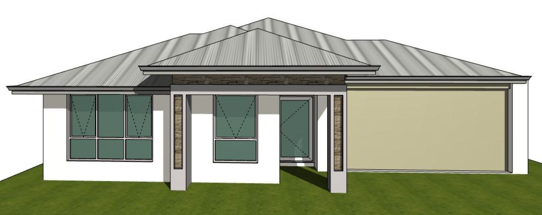 render to photorealistic image clear skies and landscaping to front yard keep the same colour scheme tint windows dark grey remove lines on front door roof to be corrugated steel