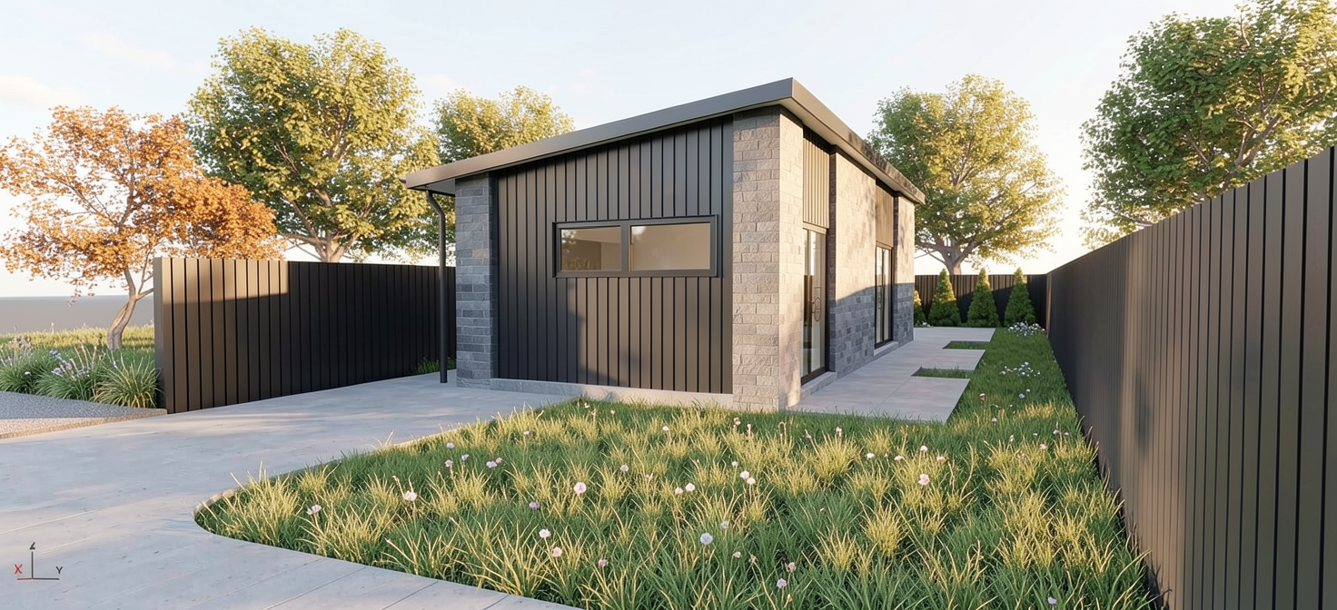 grass lawn with feature garden beds australian native plants and australian bush back ground semi reflective glass smooth paint finish exterior walls