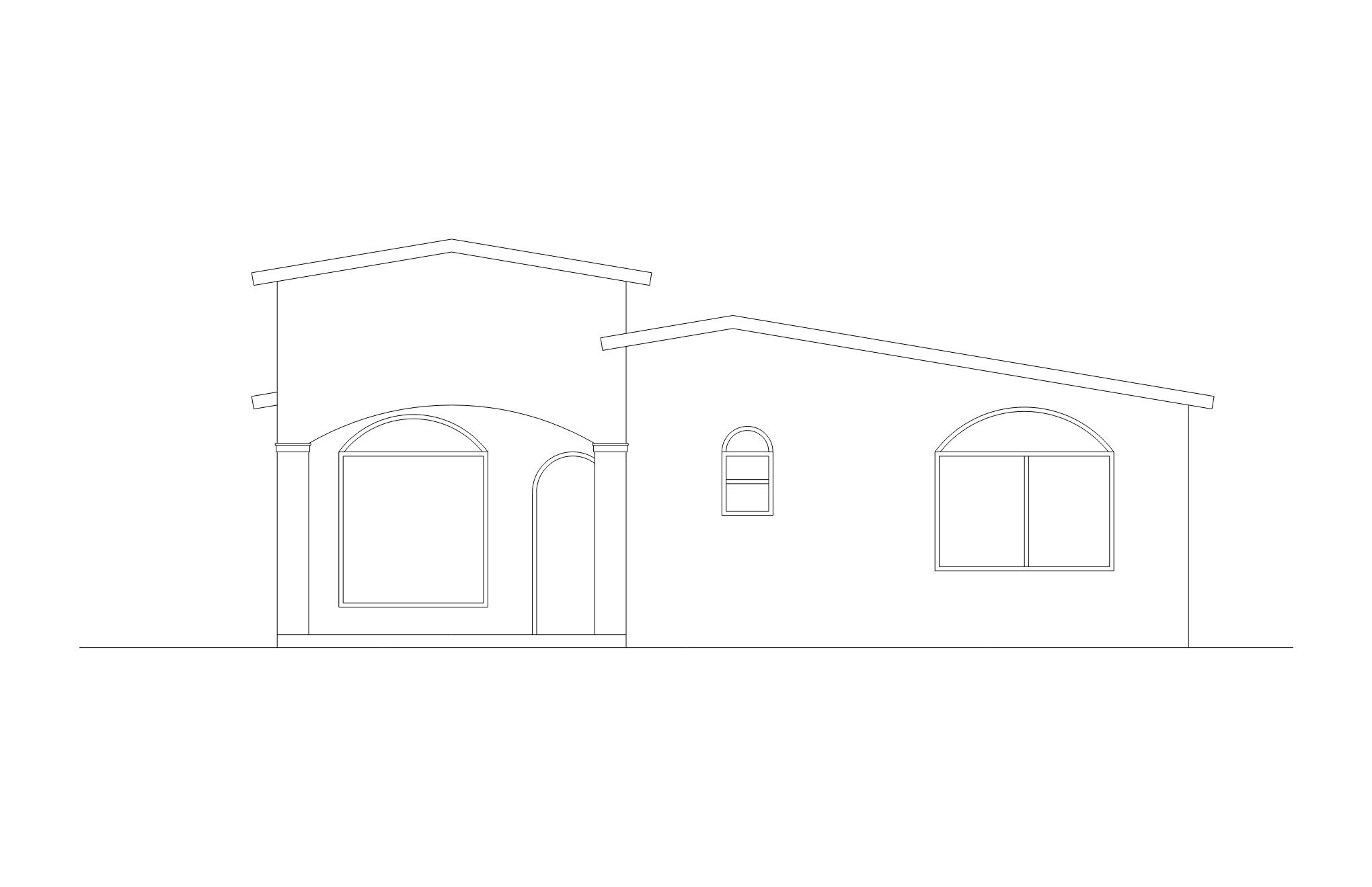 render a modern minimalist house with a bright white stucco exterior accented by light gray trim the roof is a soft terracotta color large arched windows with clear glass reflect the soft warm glow of the sunset sky the scene is bathed in golden hour light creating a serene tranquil atmosphere add lush greenery around the base with vibrant green grass and a few small bushes for a natural touch under a clear blue sky walway towards the entrance
