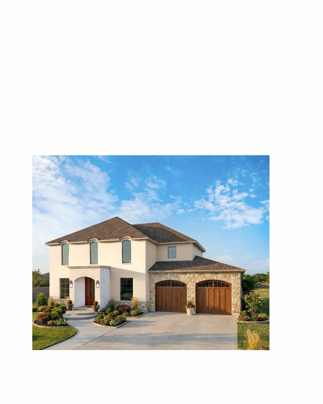 make front steps curved make front door wood tone to match garage doors make image hyper realistic add landscaping and sidewalk leading to front door