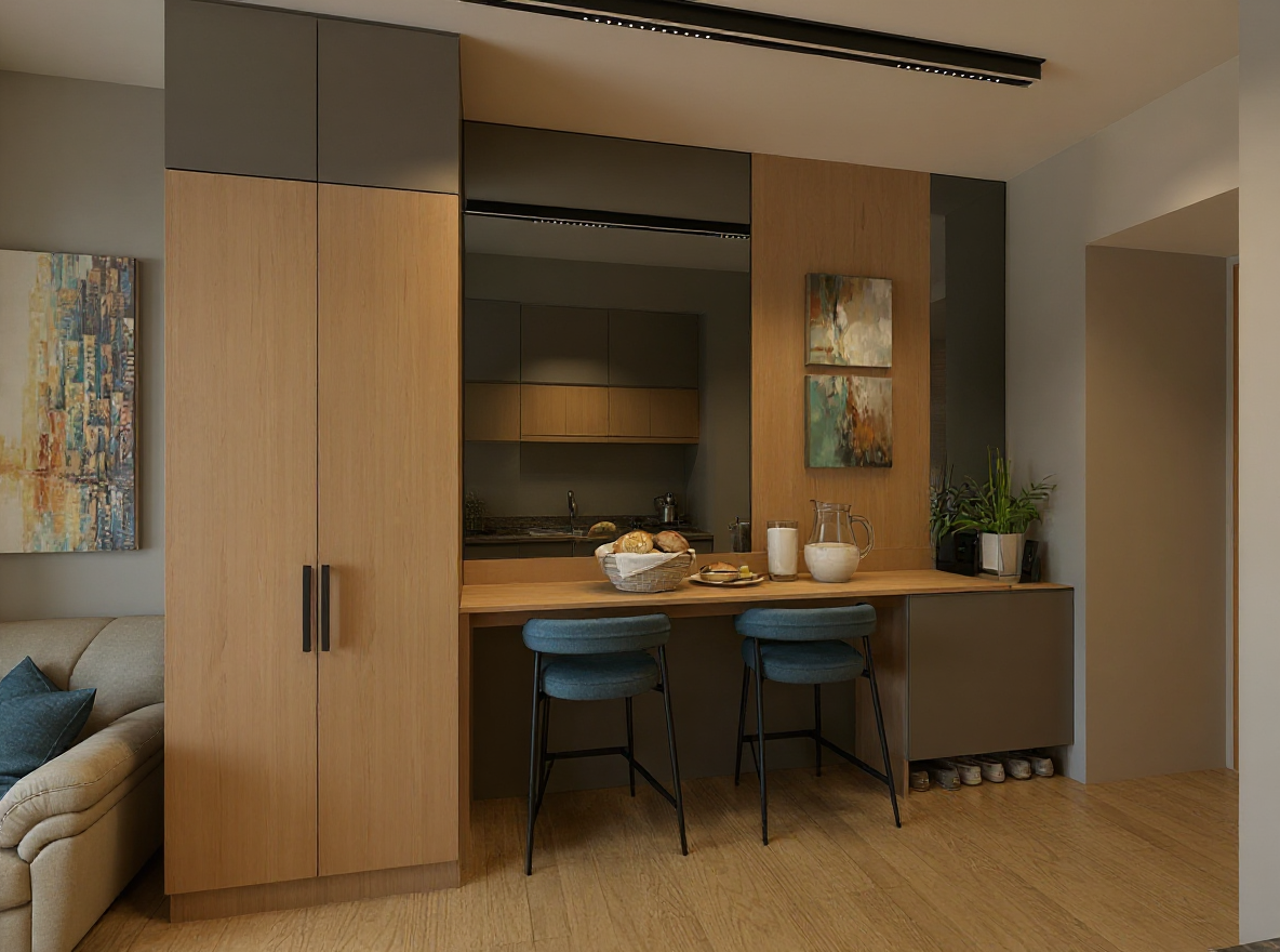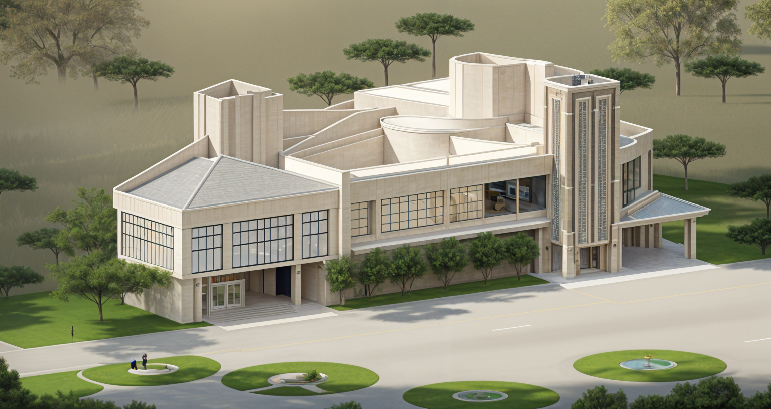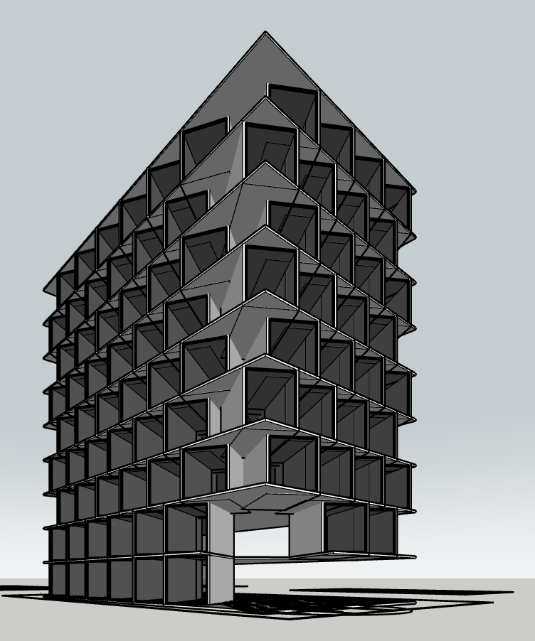 render a modern architectural building with a unique geometric design featuring a grid like facade the structure is composed of sleek metallic panels in shades of charcoal gray and silver illuminate the scene with warm golden sunlight casting dynamic shadows enhancing the three dimensional appearance the sky is a soft gradient of light blue transitioning to pink creating a serene evening atmosphere surround the building with a minimalist paved landscape in subtle gray tones ensuring a calm harmonious environment