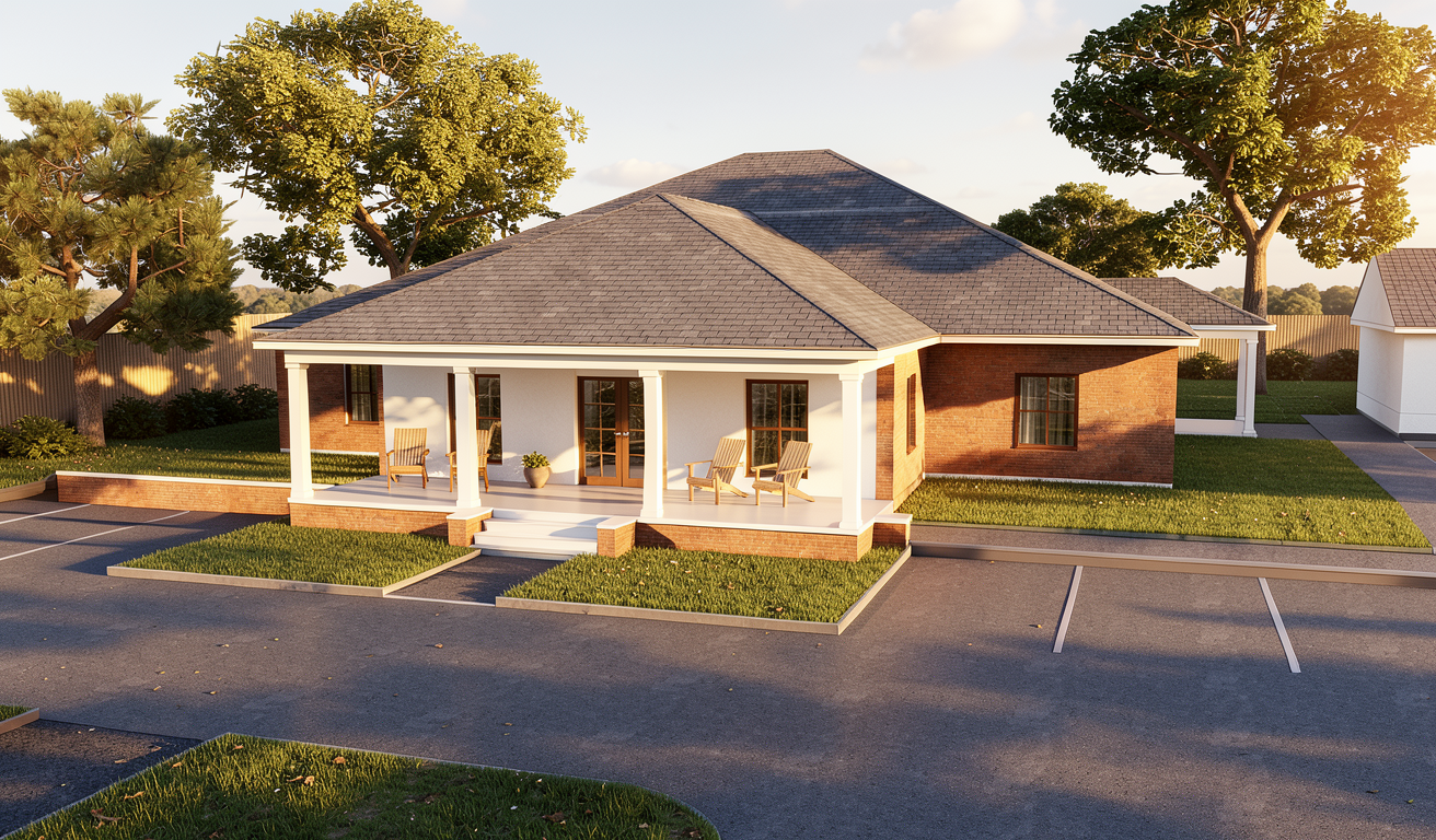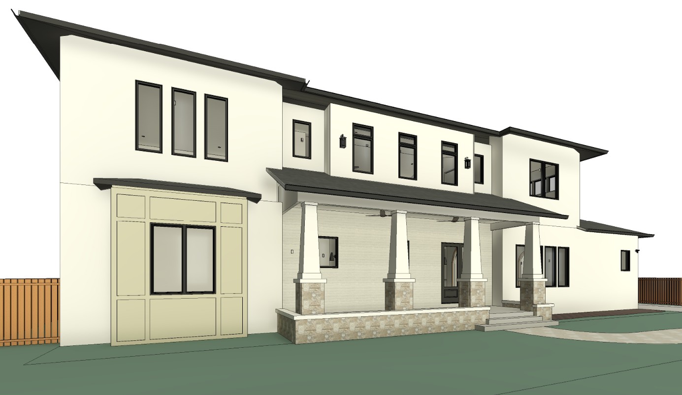 render a photorealistic 3d perspective of this house reference the current material style just enhance them asphalt roof stucco wall keep model geometry the same windows doors roof pavement driveway add vegetation intentiaonlly that ooks native change the view only to enhance the current materials and make the landscape nicer vegetation detailed textures in the wood siding and glass reflections and a vibrant clear sky with light atmospheric depth render in hyper realistic architectural visualization quality 8k resolution
