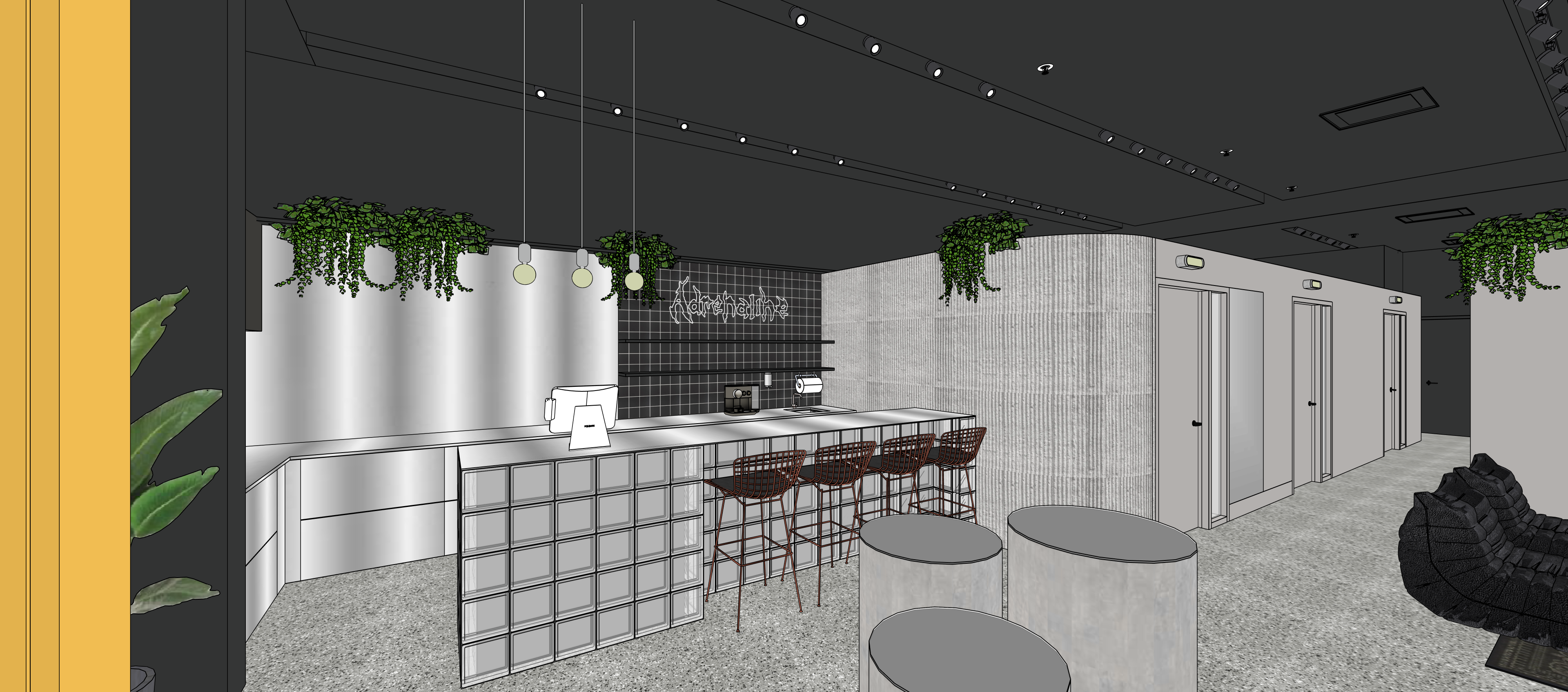 keep view and material as is backsplash is black glossy tile with white neon on it keep as image for the text on the left we have a brushed stainless steel pannel and stainless steel cabinets the counter in front is made out of glass blocks add glossyness to the floor keep same texture