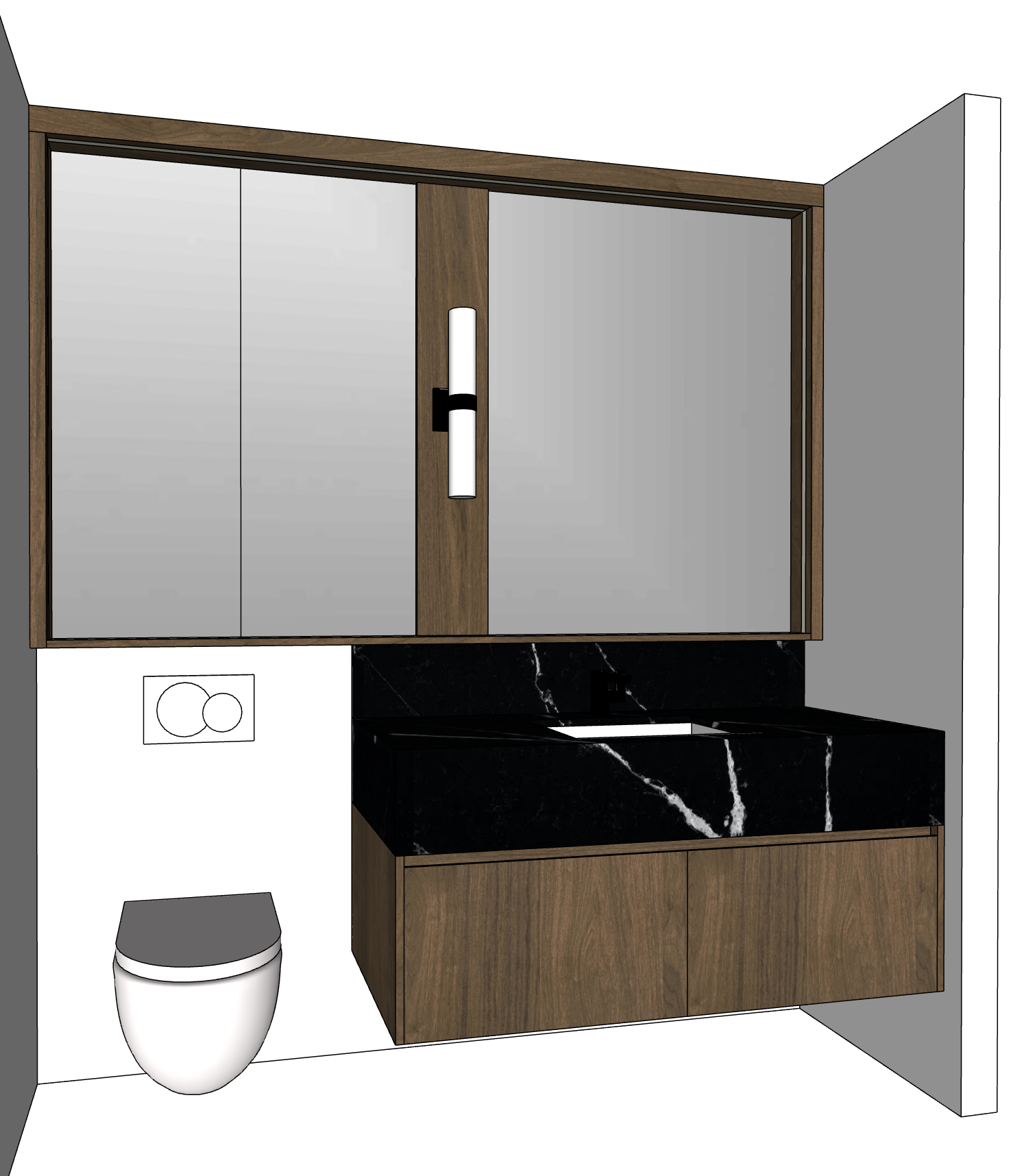 toilet and buttons for toilet is glossy white porcelain black faucet around the mirror will be led strip light on the sides and top walls are painted a creamy white