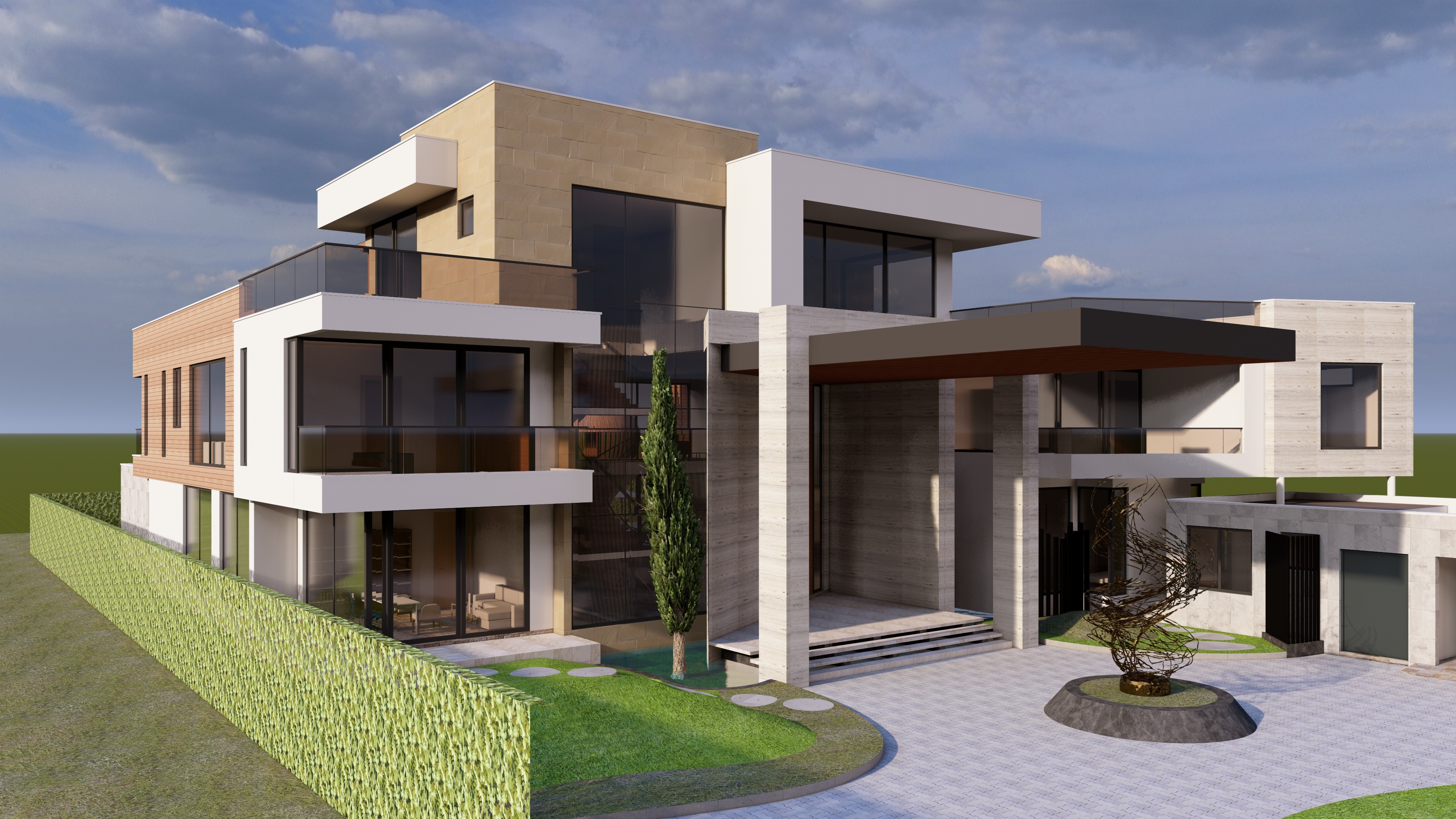 image of modern maisonette add few trees in far far background for context add very few vegetation including very very few floral ones for context as well make scene look lived in there should not be any haziness or excess strength from the sun light or sun rays